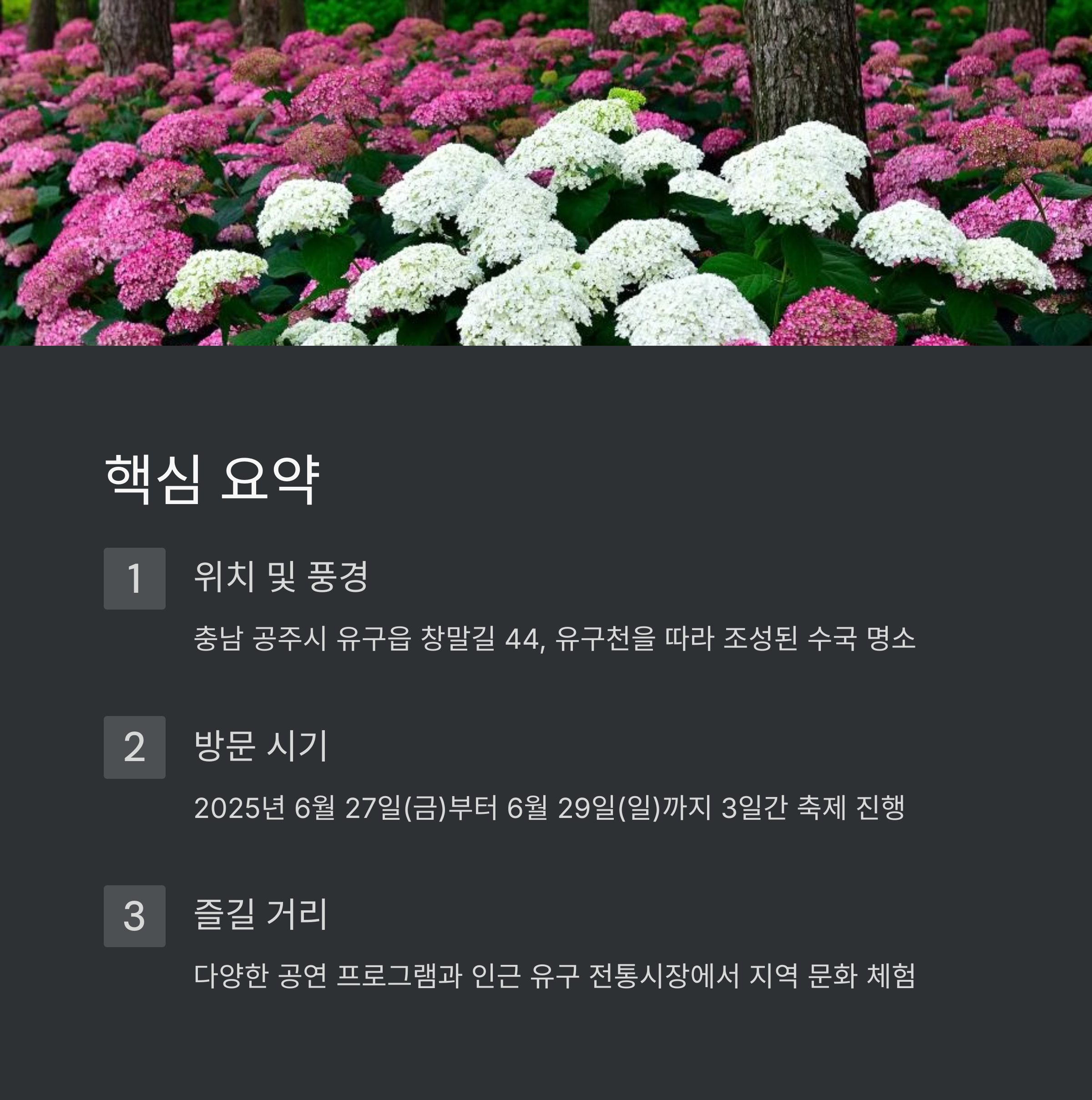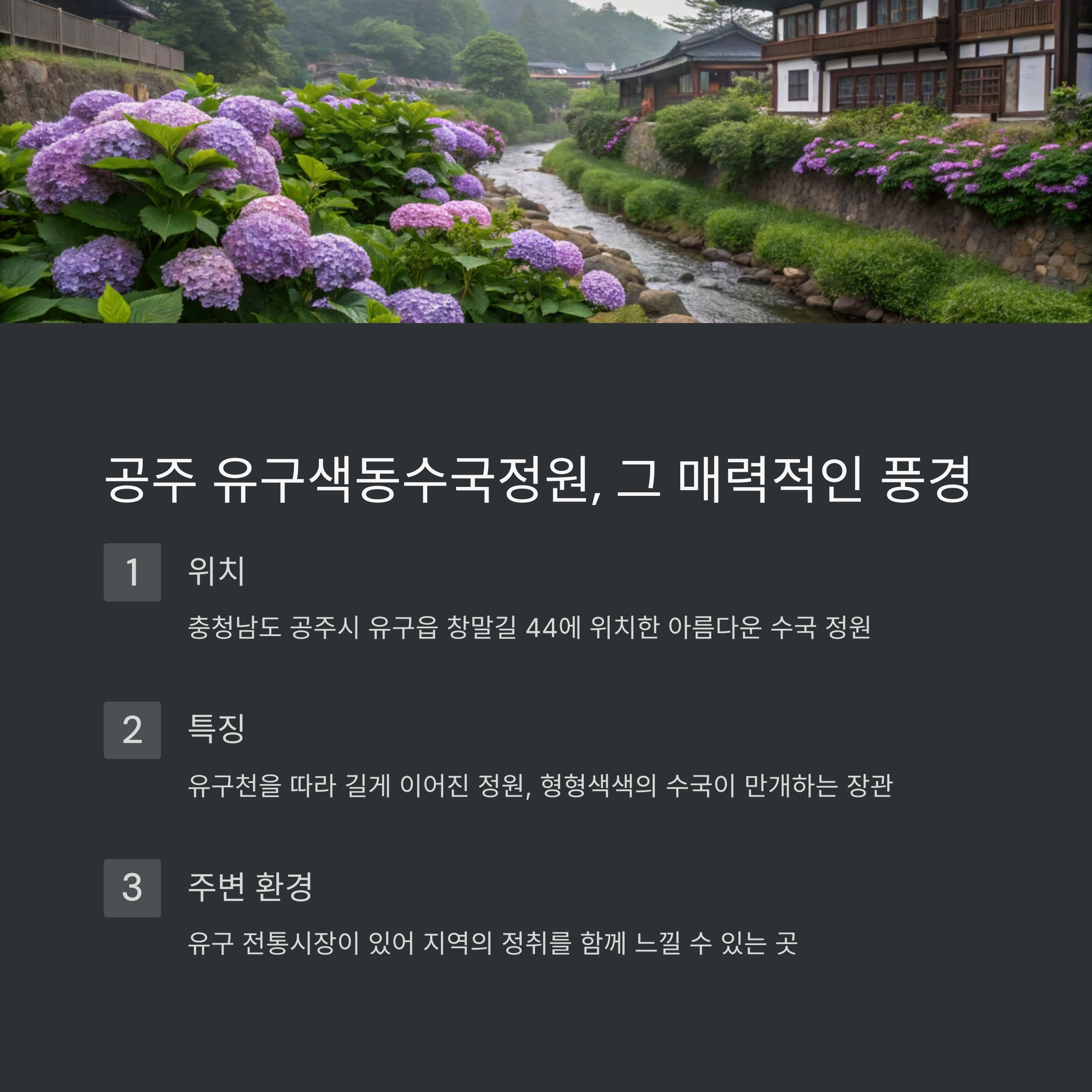 - 위치 및 풍경: 충남 공주시 유구읍 창말길 44에 위치한 유구색동수국정원은 유구천을 따라 조성된 수국 명소이며, 유구 전통시장과 인접해 지역 정취를 함께 느낄 수 있습니다.