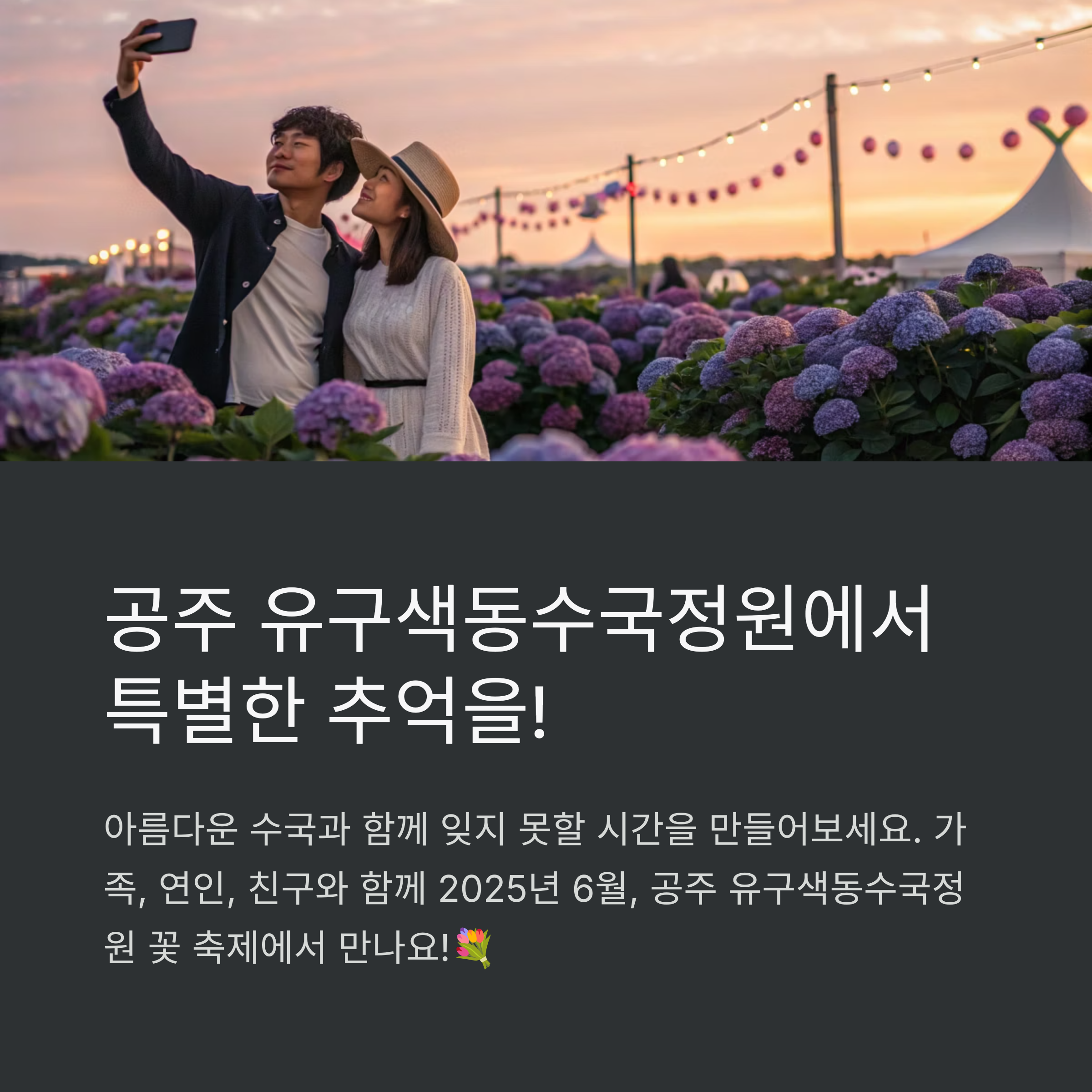 공주 유구색동수국정원 꽃 축제는 아름다운 수국과 함께 특별한 추억을 만들 수 있는 좋은 기회입니다. 다가오는 6월, 가족, 연인, 친구와 함께 이곳에서 잊지 못할 시간을 보내시길 바랍니다! 😊