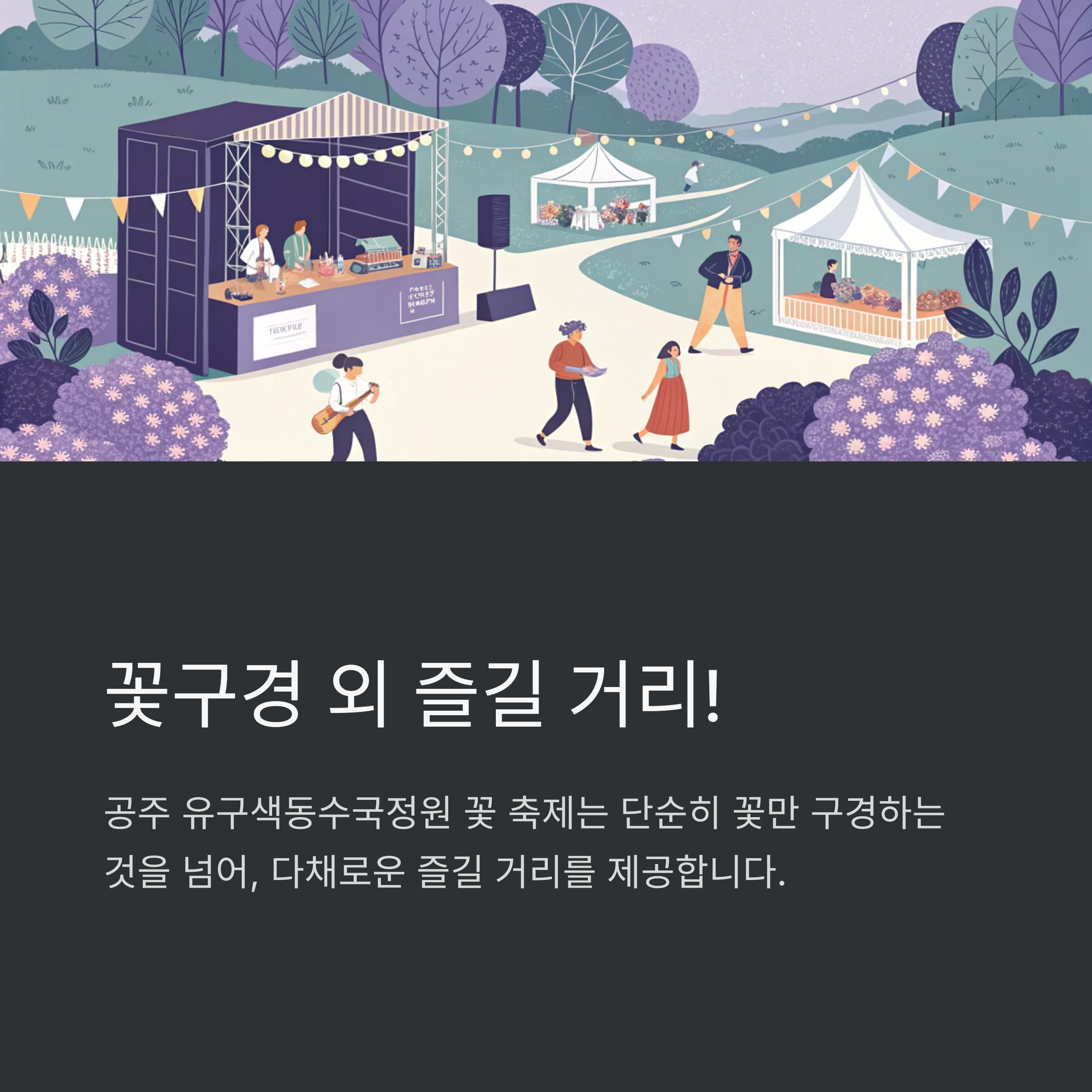 공주 유구색동수국정원 꽃 축제는 단순히 꽃만 구경하는 것을 넘어, 다채로운 즐길 거리를 제공합니다.