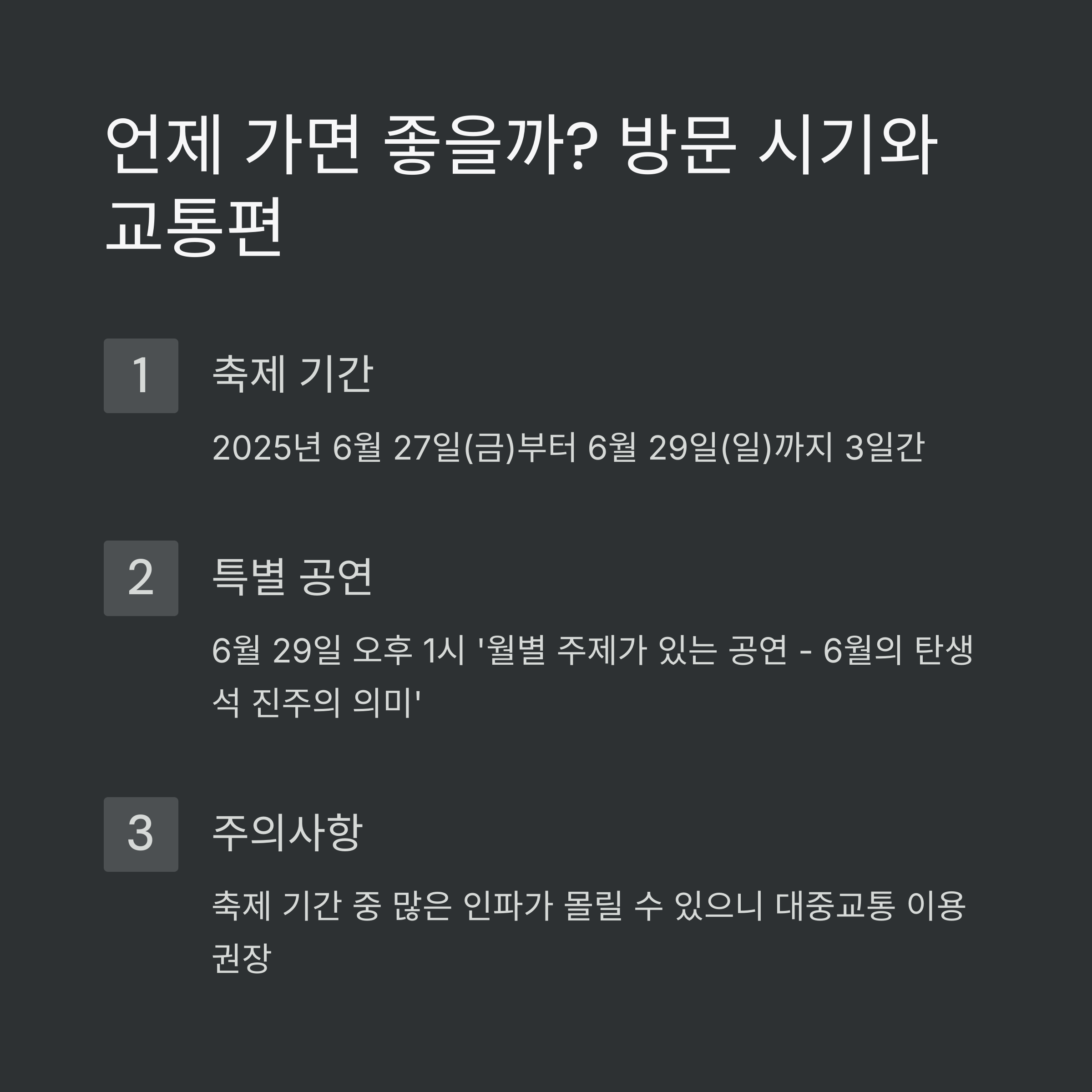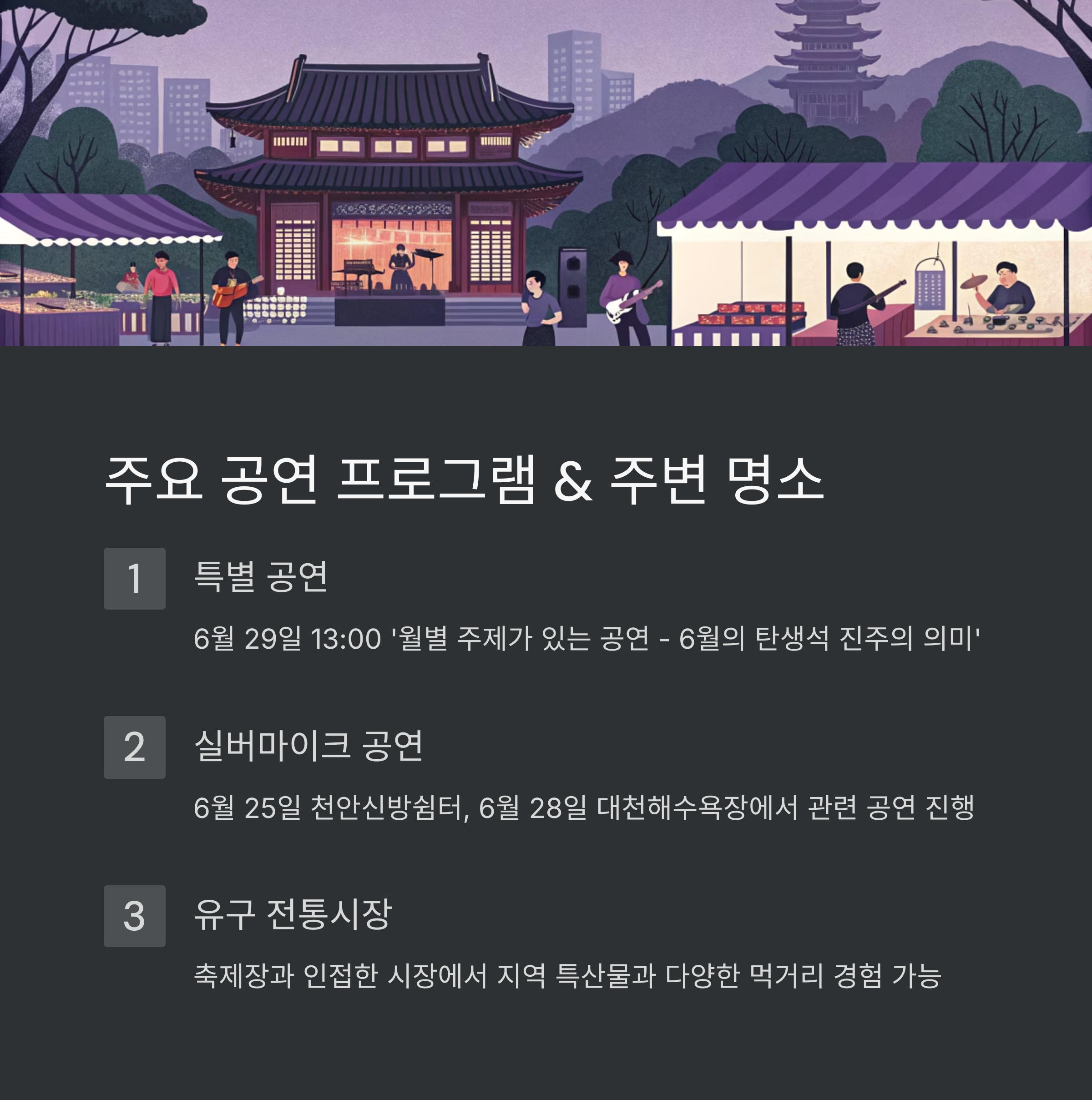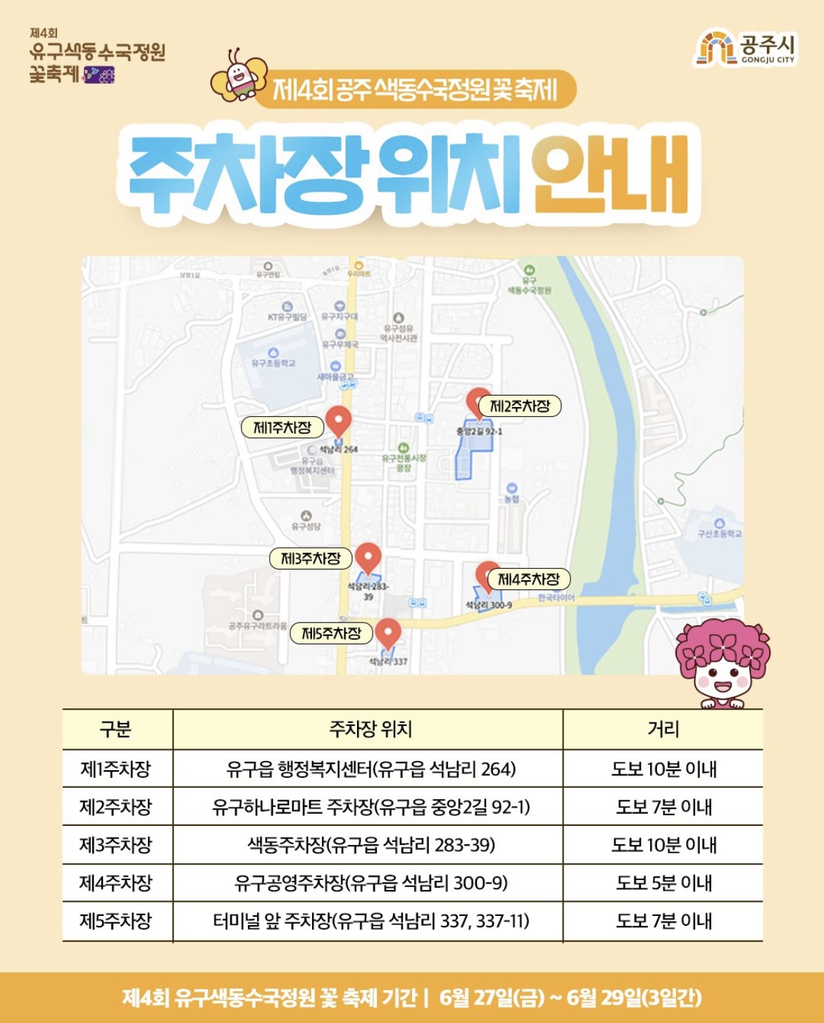 - 방문 시기 및 교통: 2025년 6월 27일(금)부터 6월 29일(일)까지 3일간 축제가 진행되며, 자차 이용 시 5곳의 임시 주차장 이용이 가능하고, 대중교통은 유구읍 터미널을 이용할 수 있습니다.