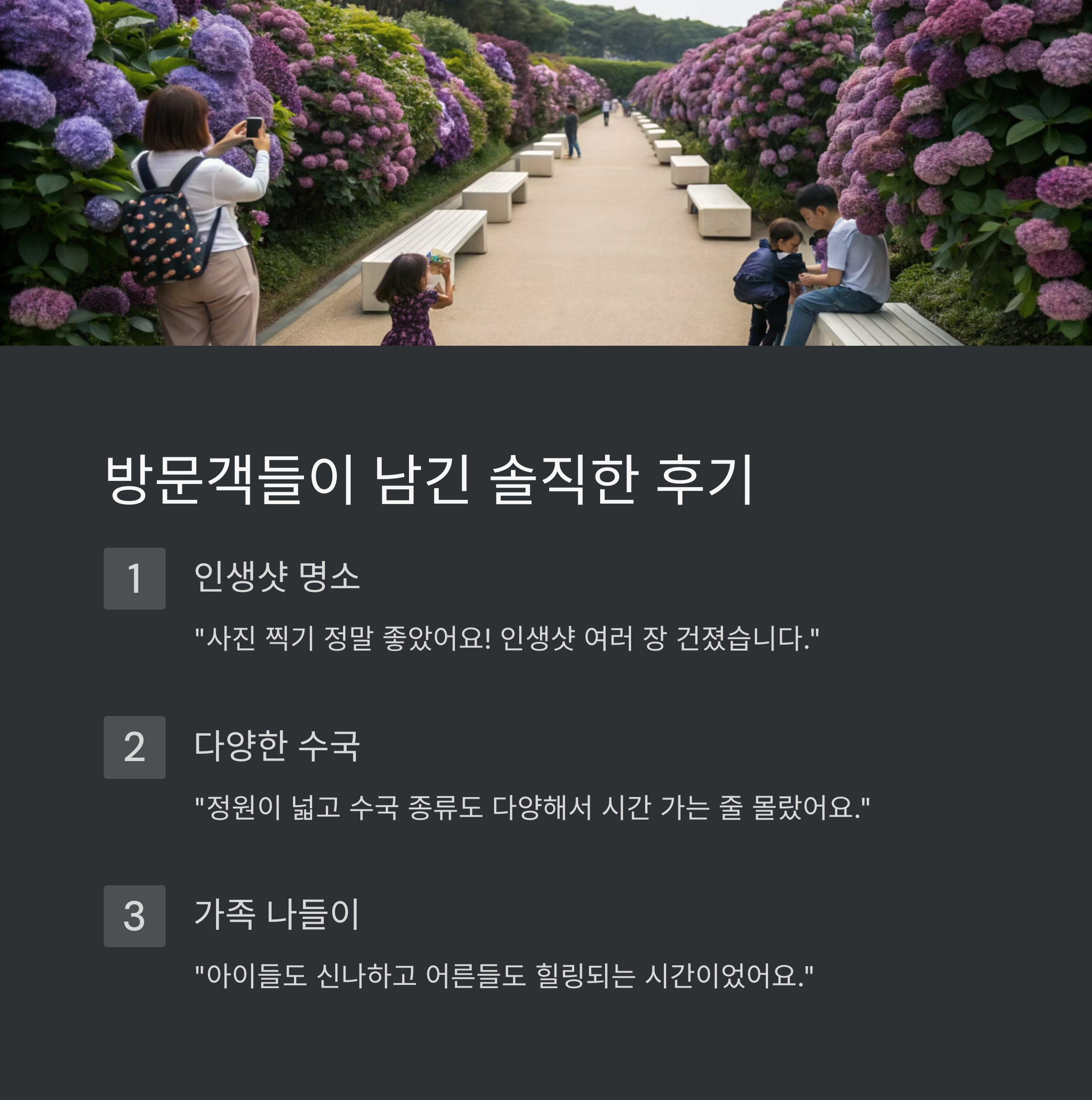 - "생각보다 정원이 넓고 수국 종류도 다양해서 시간 가는 줄 몰랐어요."