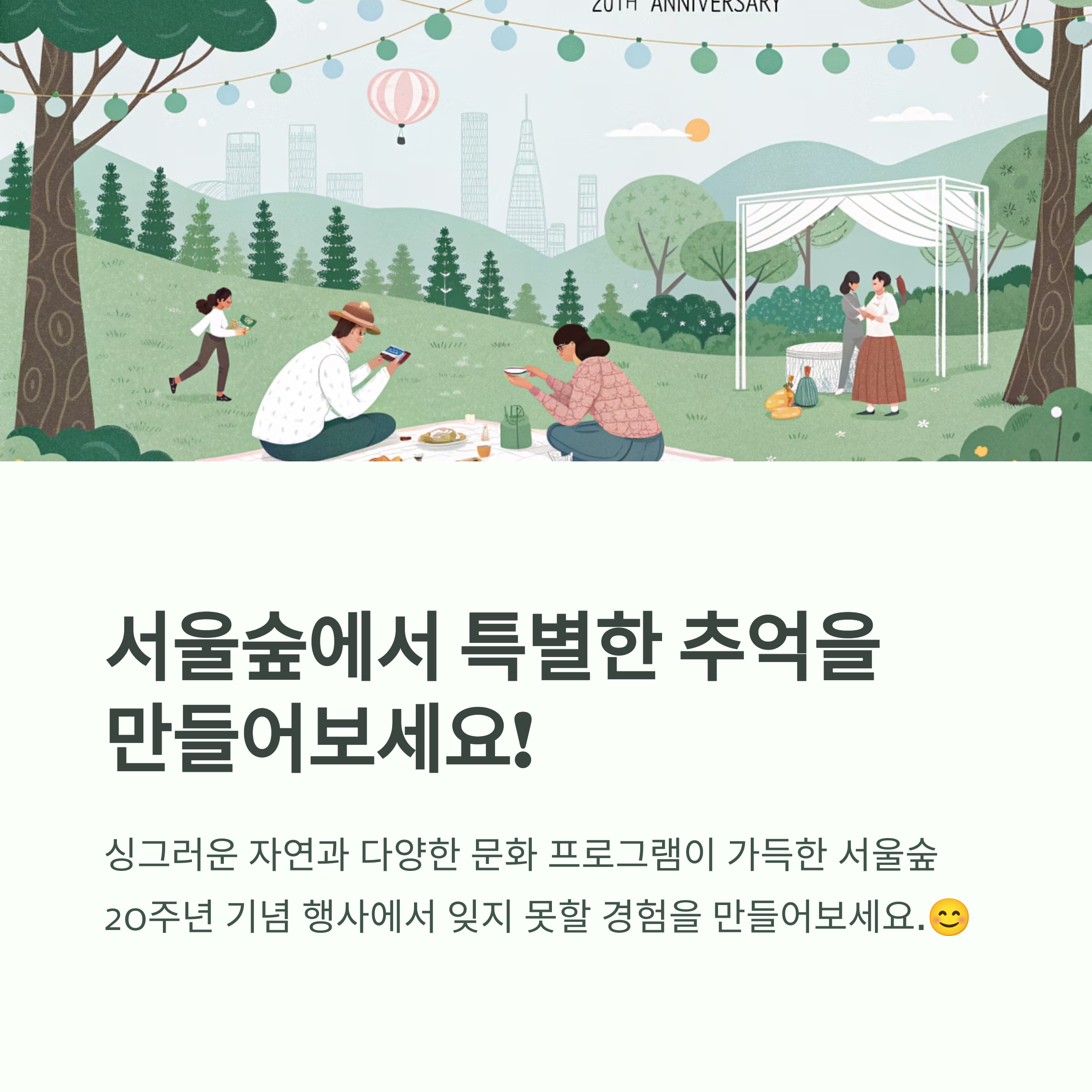 싱그러운 초록빛으로 가득한 서울숲에서 특별한 문화행사가 열립니다. 서울숲 개원 20주년을 기념하는 '스물 서울숲'은 자연 속에서 몸과 마음을 치유하고, 다양한 체험과 공연을 통해 새로운 추억을 선사할 거예요. 지금부터 서울숲의 매력과 함께 이번 행사를 즐기는 모든 팁을 알려드릴게요.