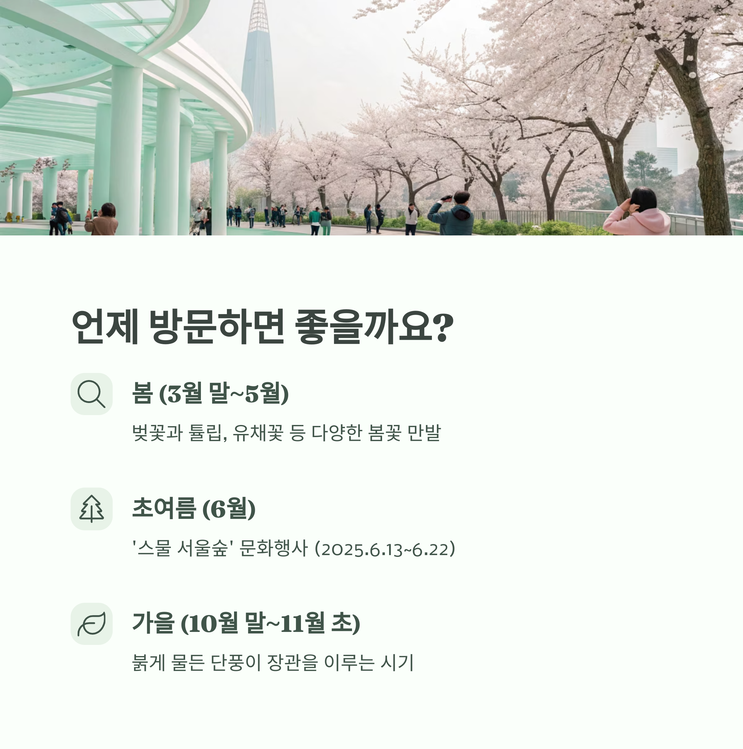 - 초여름 (6월): '스물 서울숲' 문화행사(2025년 6월 13일 ~ 6월 22일)가 열리는 시기로, 싱그러운 녹음 속에서 다채로운 체험과 공연을 즐기기 좋습니다.