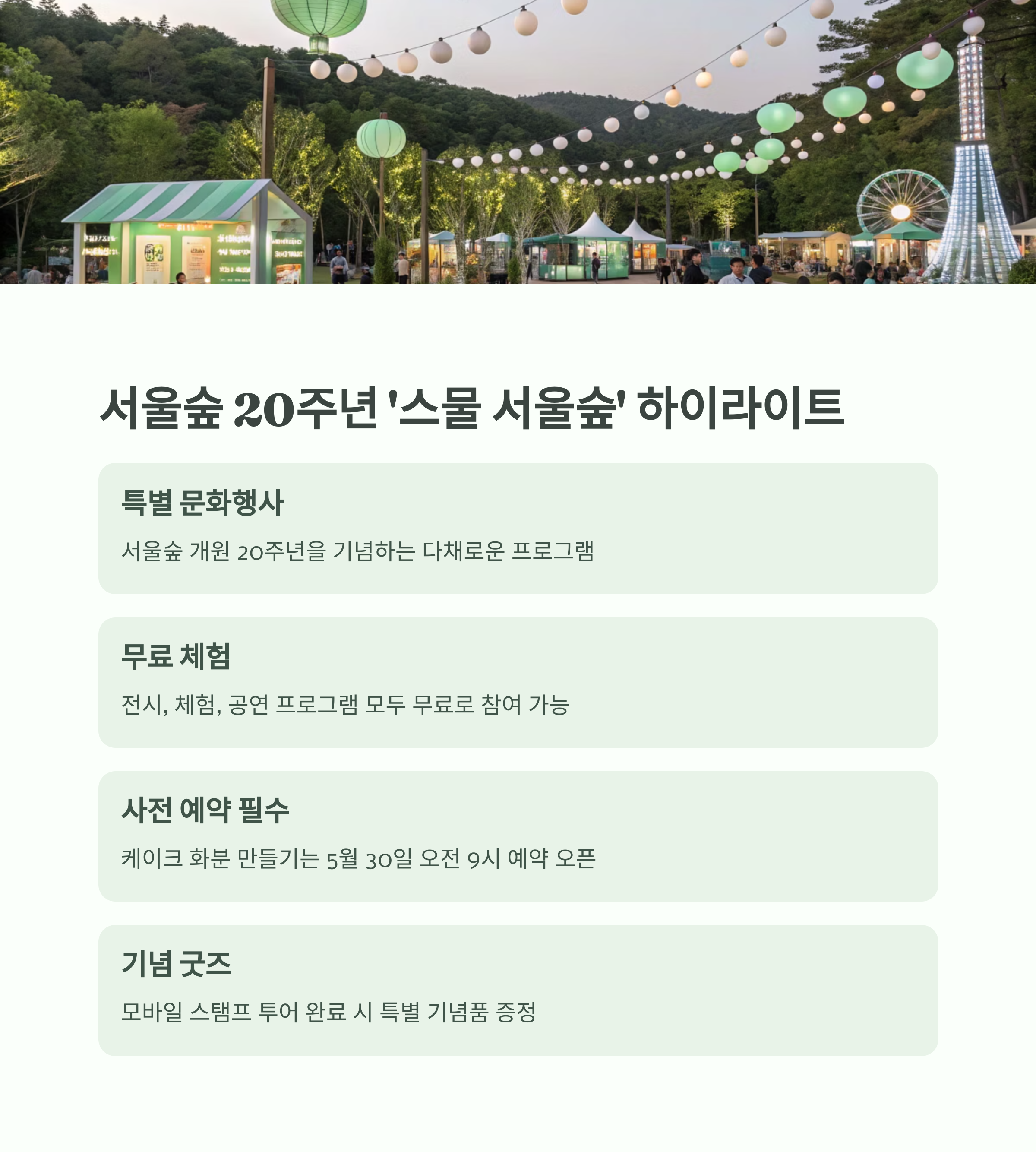 서울숲 개원 20주년 기념 '스물 서울숲' 문화행사는 6월 13일부터 22일까지 서울숲에서 열리며, 다양한 무료 체험과 공연을 통해 자연과 함께하는 특별한 경험을 제공합니다.