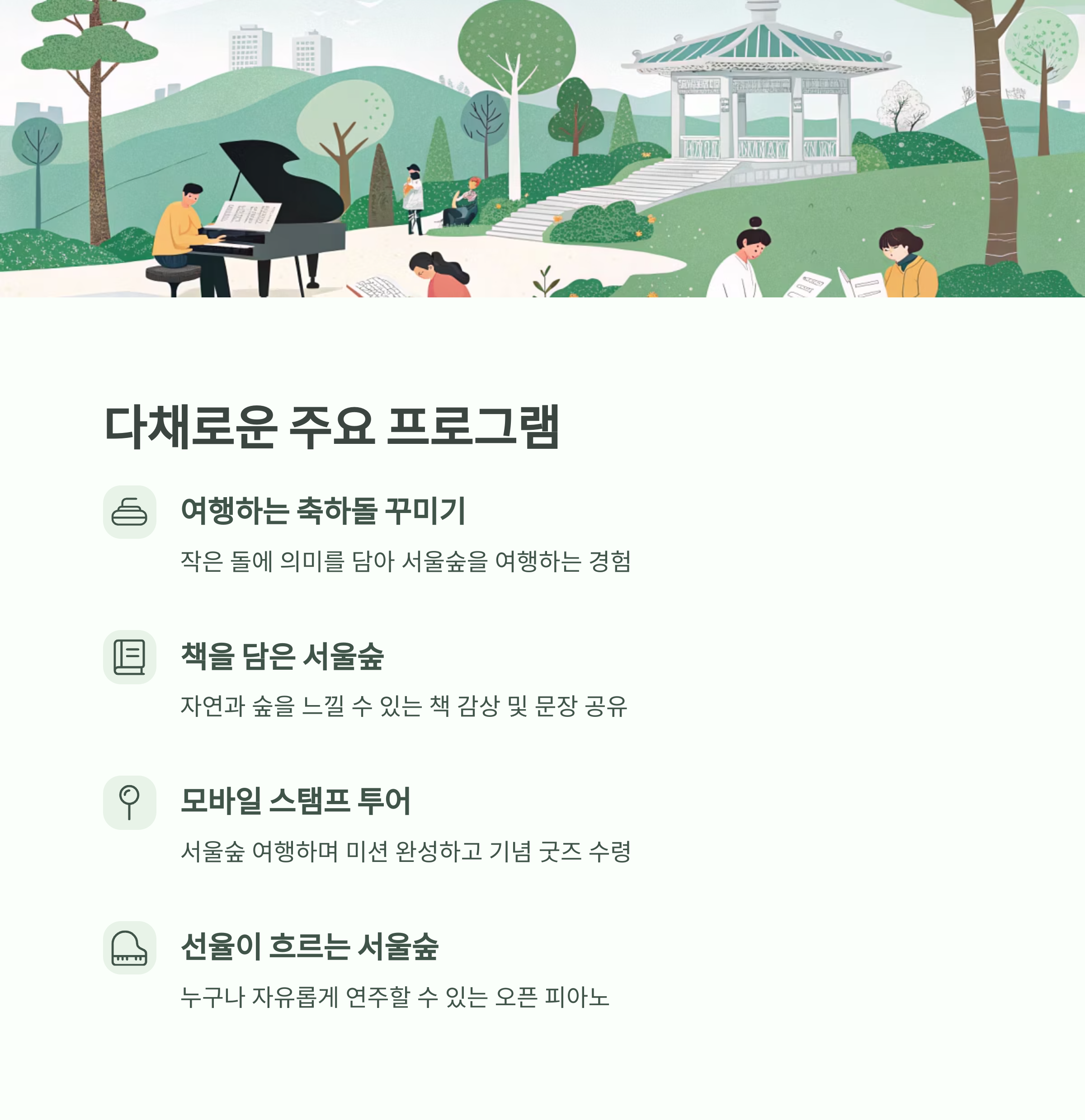 - 행사 내용: '여행하는 축하돌 꾸미기', '책을 담은 서울숲', '모바일 스탬프 투어', '오픈 피아노' 등 현장 참여 프로그램과 '케이크 화분 만들기'(사전 예약), '돌돌 정원', '모루 꽃반지' 등 체험 프로그램이 마련되어 있습니다.