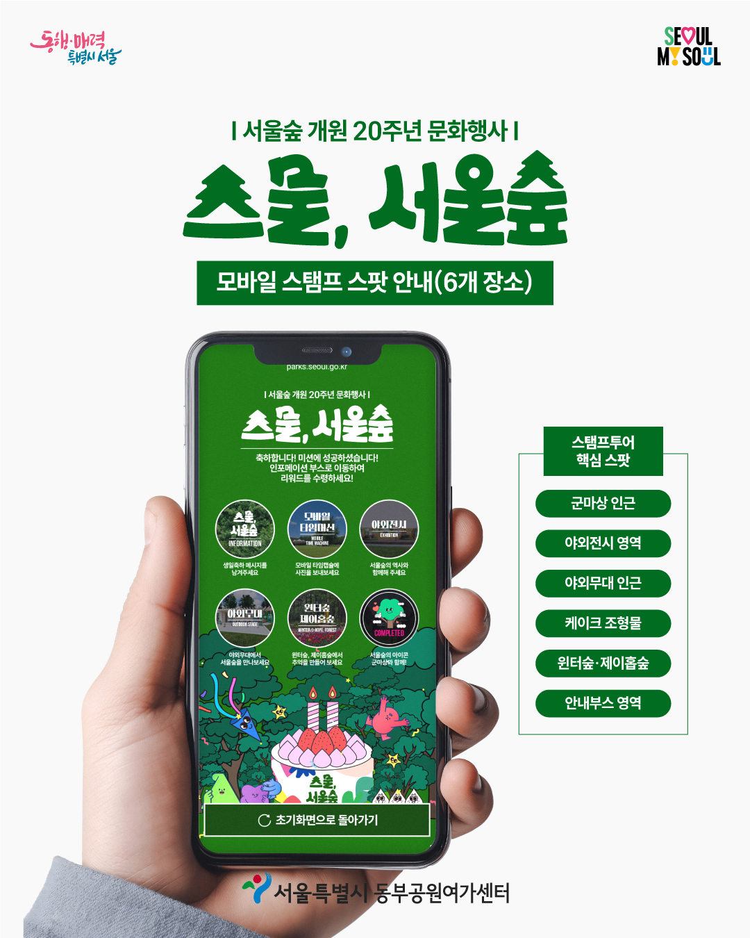 - 참여 방법: 안내부스 QR코드 스캔 → 서울숲 6곳 스팟 방문하여 스탬프 모으기 → 스탬프 6개 모두 모으면 특별 기념 굿즈 수령!