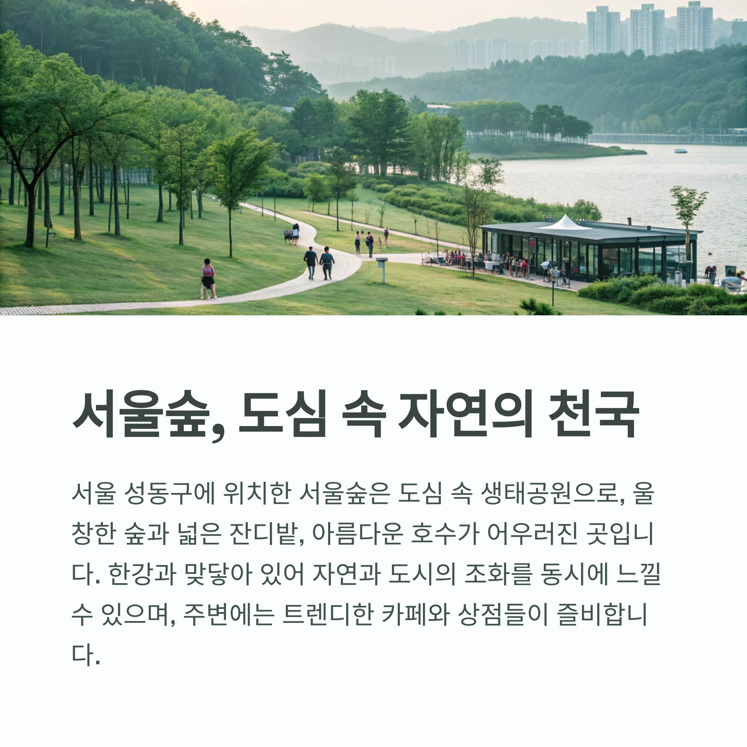 - 위치 및 특징: 서울 성동구에 위치한 도심 속 생태공원으로, 울창한 숲, 넓은 잔디밭, 호수가 어우러진 자연 명소입니다. 주변에는 트렌디한 카페와 상점들이 많습니다.