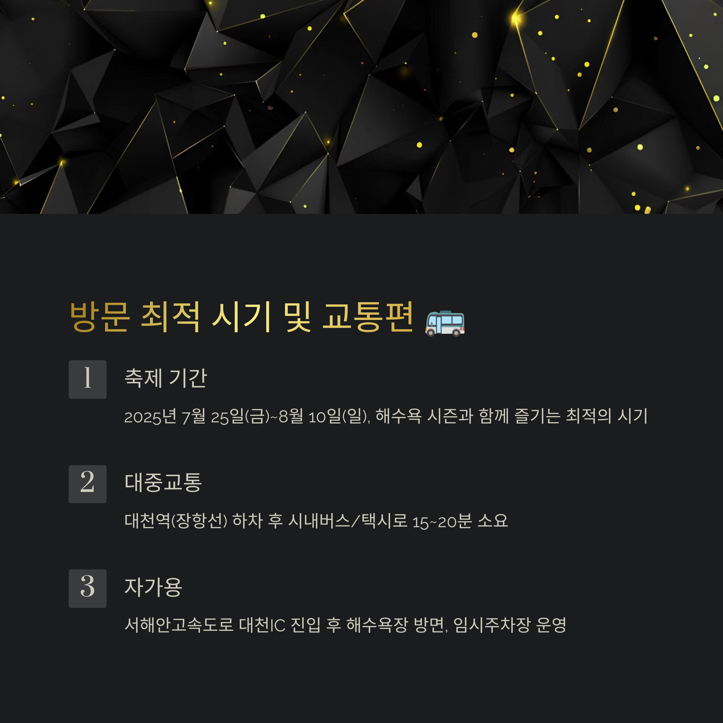 - 🚗 자차 이용 시: 서해안고속도로 대천IC를 통해 진입 후, 대천해수욕장 방면으로 이동하면 됩니다. 축제 기간에는 행사장 주변에 임시 주차장이 운영될 예정이며, 대천해수욕장 공영주차장 등 여러 주차 시설을 이용할 수 있습니다. 주말 및 행사 집중 시간에는 주차 공간이 혼잡할 수 있으니 대중교통 이용을 고려하거나 미리 주차 정보를 확인하는 것이 좋습니다.