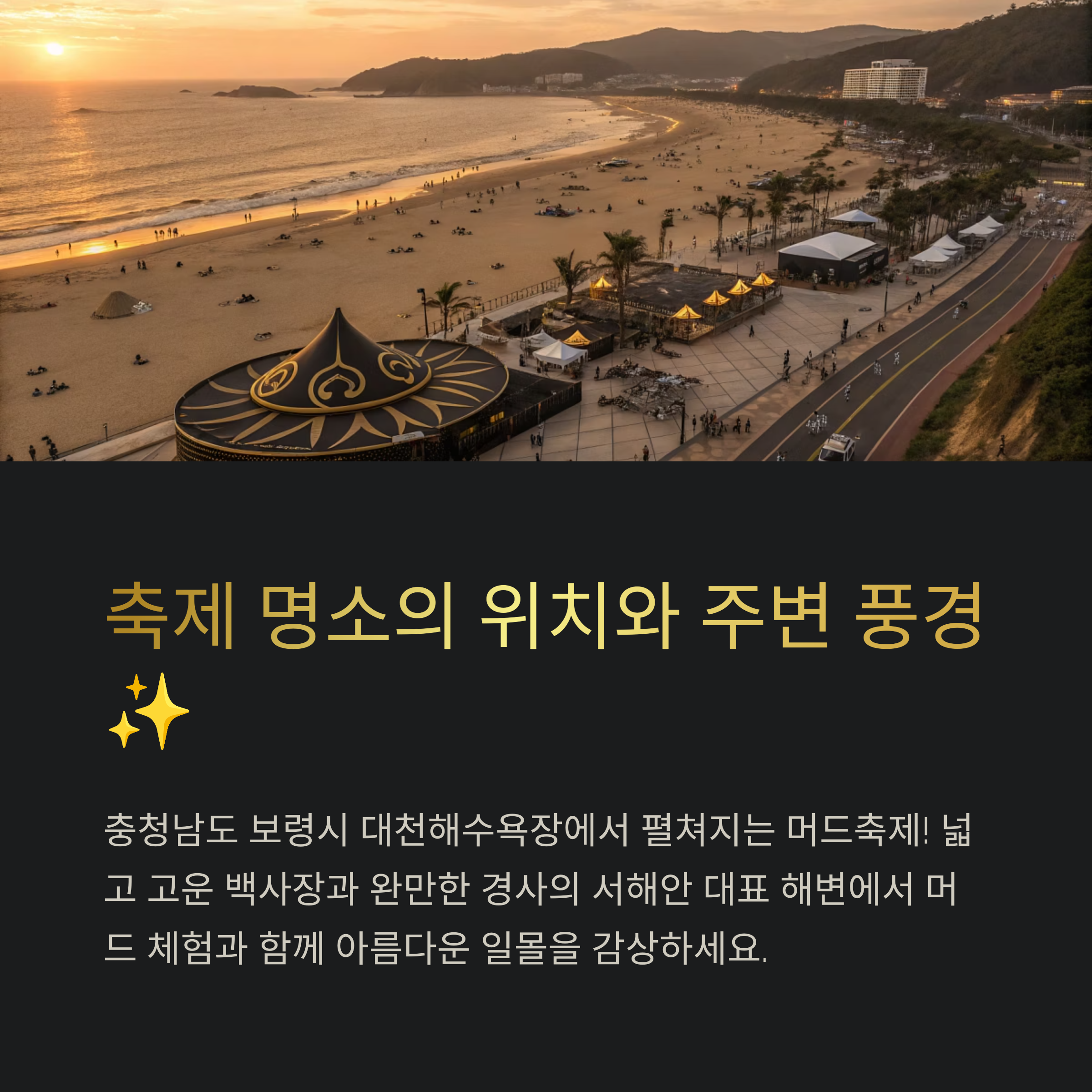 - 주변 즐길 거리: 짚트랙, 스카이바이크, 대천항 수산시장, 개화예술공원, 석탄박물관 등 다양한 관광 명소가 인접해 있어 축제와 함께 보령의 매력을 만끽할 수 있습니다.