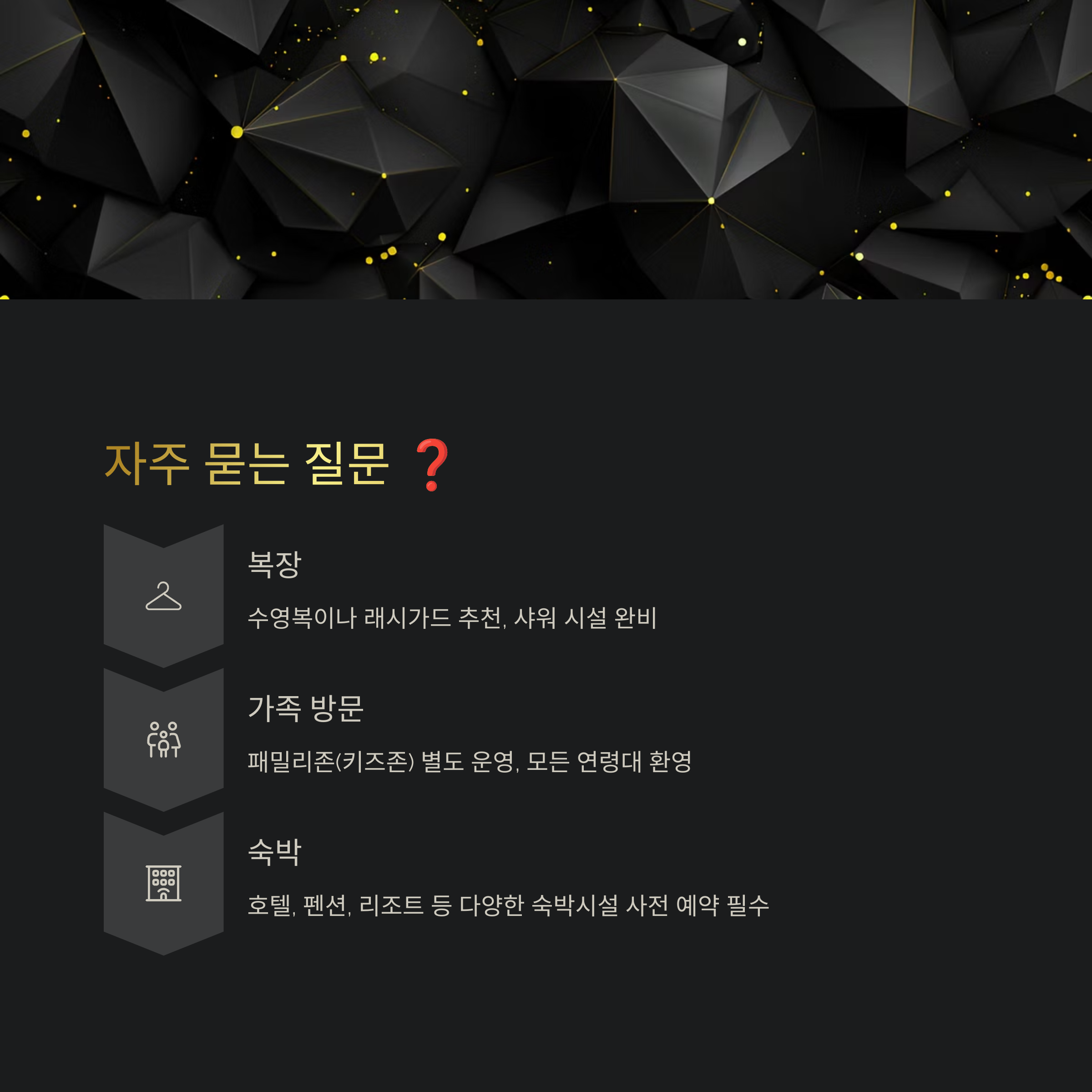 - 체험존 운영: 일반존, 패밀리존(키즈존), 워터파크존으로 나뉘어 운영되며, 주중 13:00~18:00, 주말 10:00~18:00까지 이용 가능합니다. (점심시간 13:30~14:30)