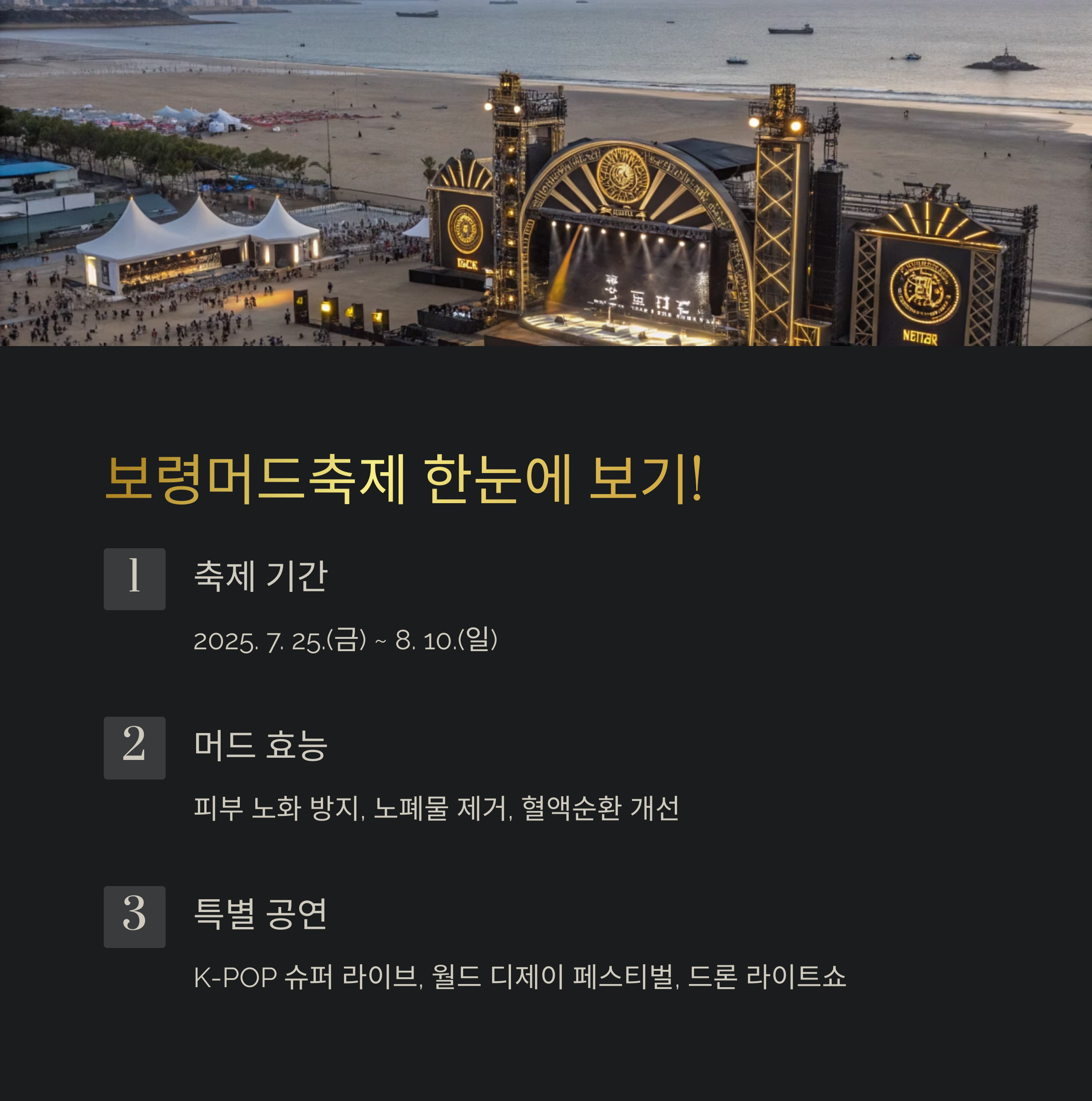 - 위치 및 기간: 대천해수욕장 및 보령머드엑스포광장에서 2025년 7월 25일부터 8월 10일까지 진행됩니다.
