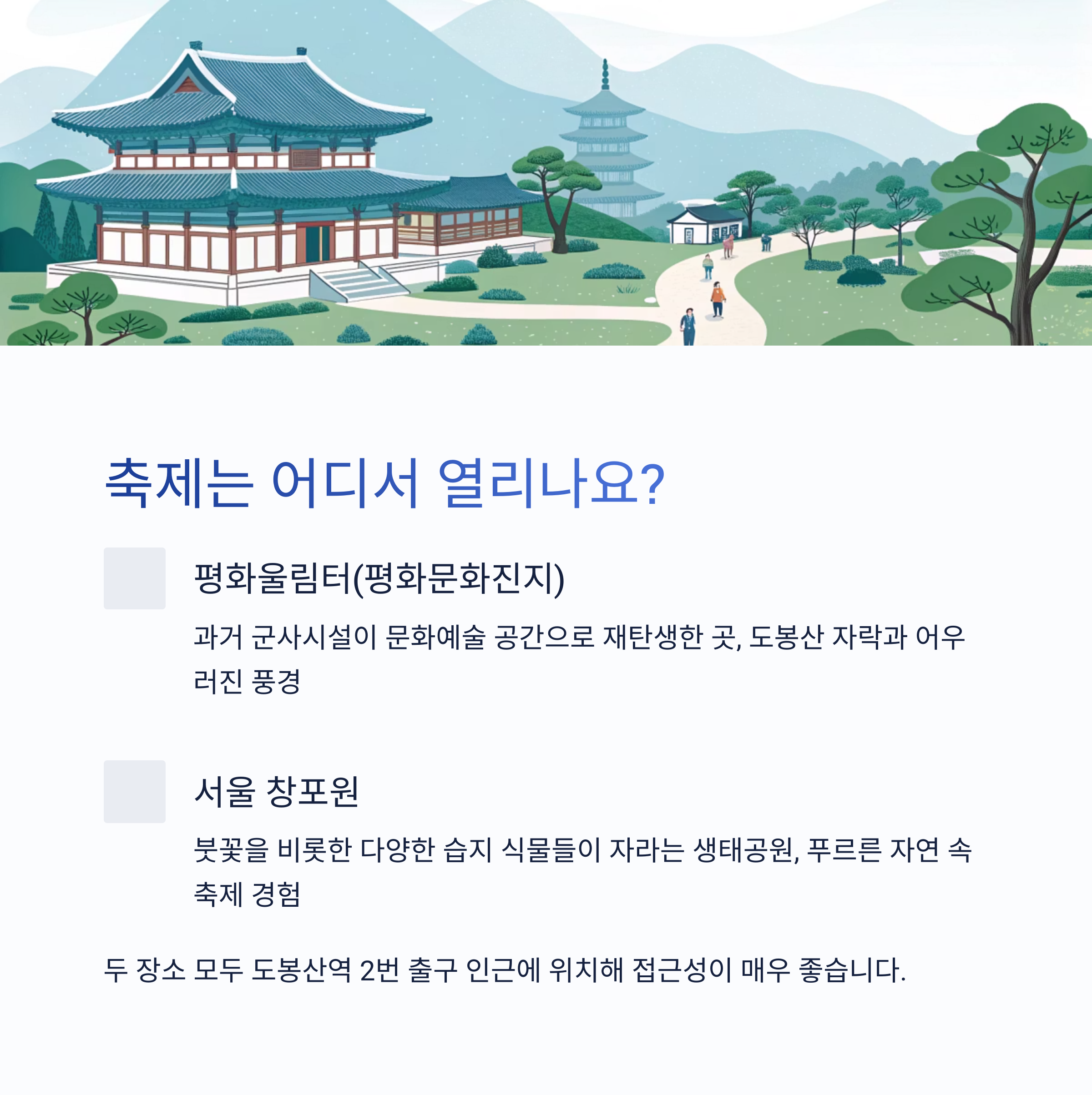 이번 문화제의 주 행사 장소는 평화울림터(평화문화진지)와 서울 창포원입니다. 이 두 곳은 모두 도봉산역 2번 출구 인근에 위치해 있어 접근성이 매우 좋습니다.