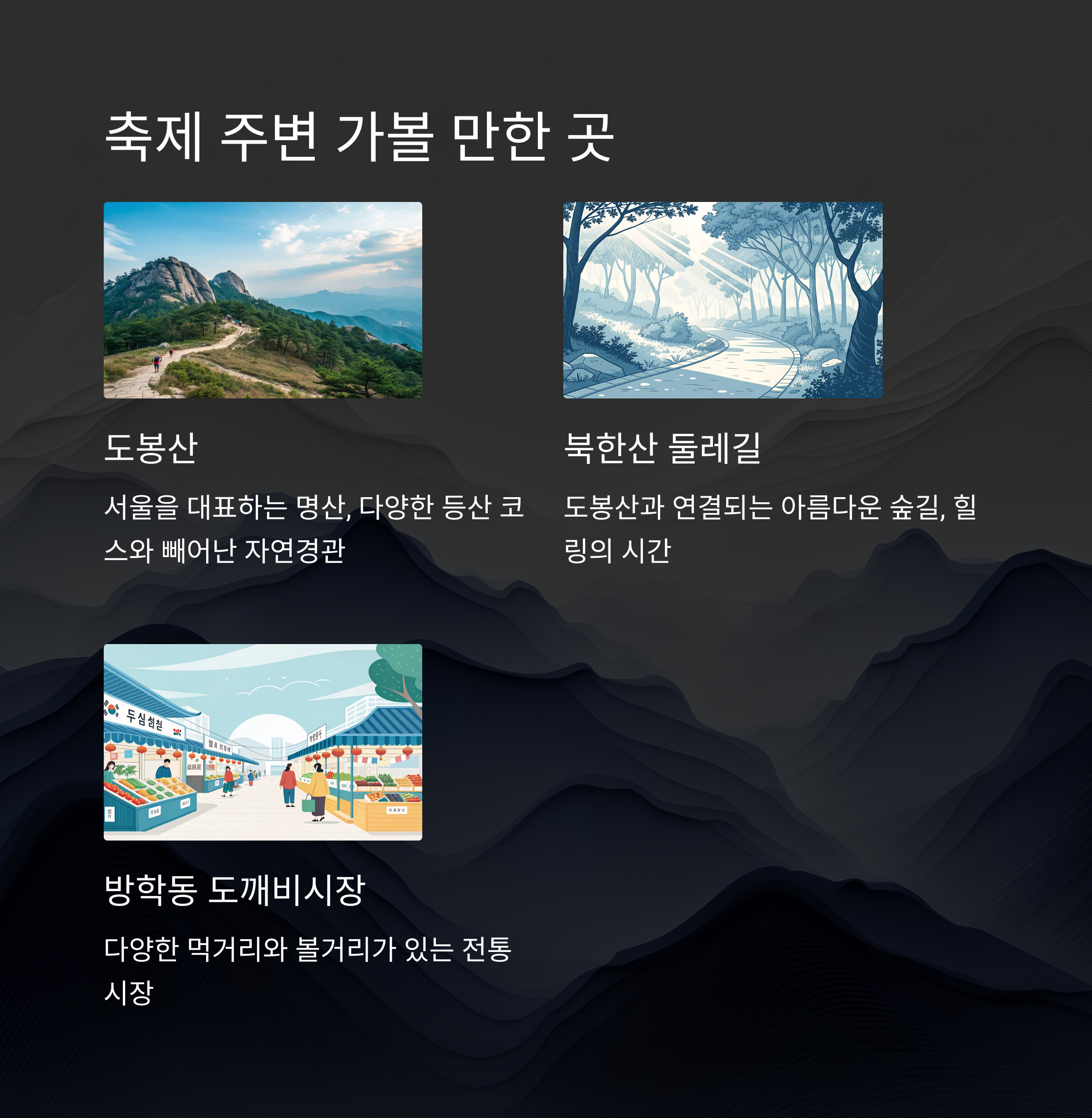 - 도봉산: 서울을 대표하는 명산 중 하나로, 다양한 등산 코스와 빼어난 자연경관을 자랑합니다. 축제를 즐기기 전후로 가벼운 산책이나 등산을 즐기기 좋습니다.