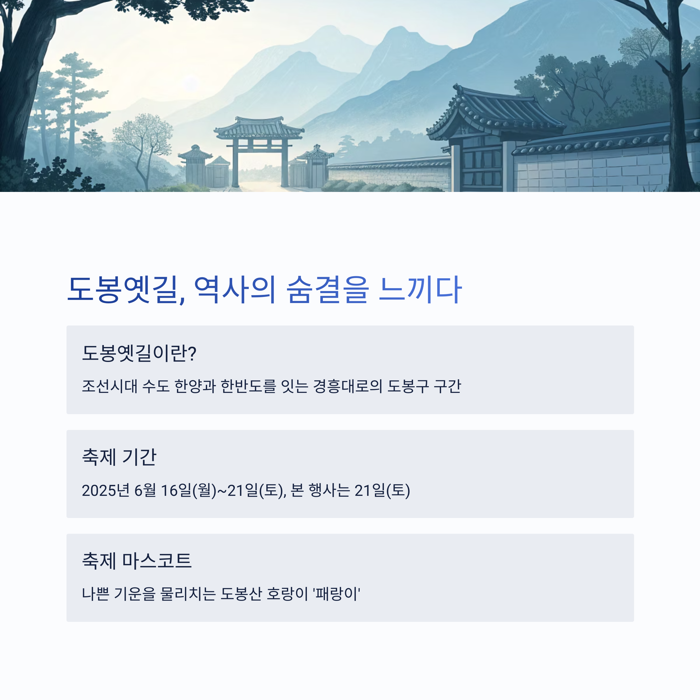 - 테마: 조선시대 도봉옛길의 역사와 도봉산 호랑이 '패랑이'