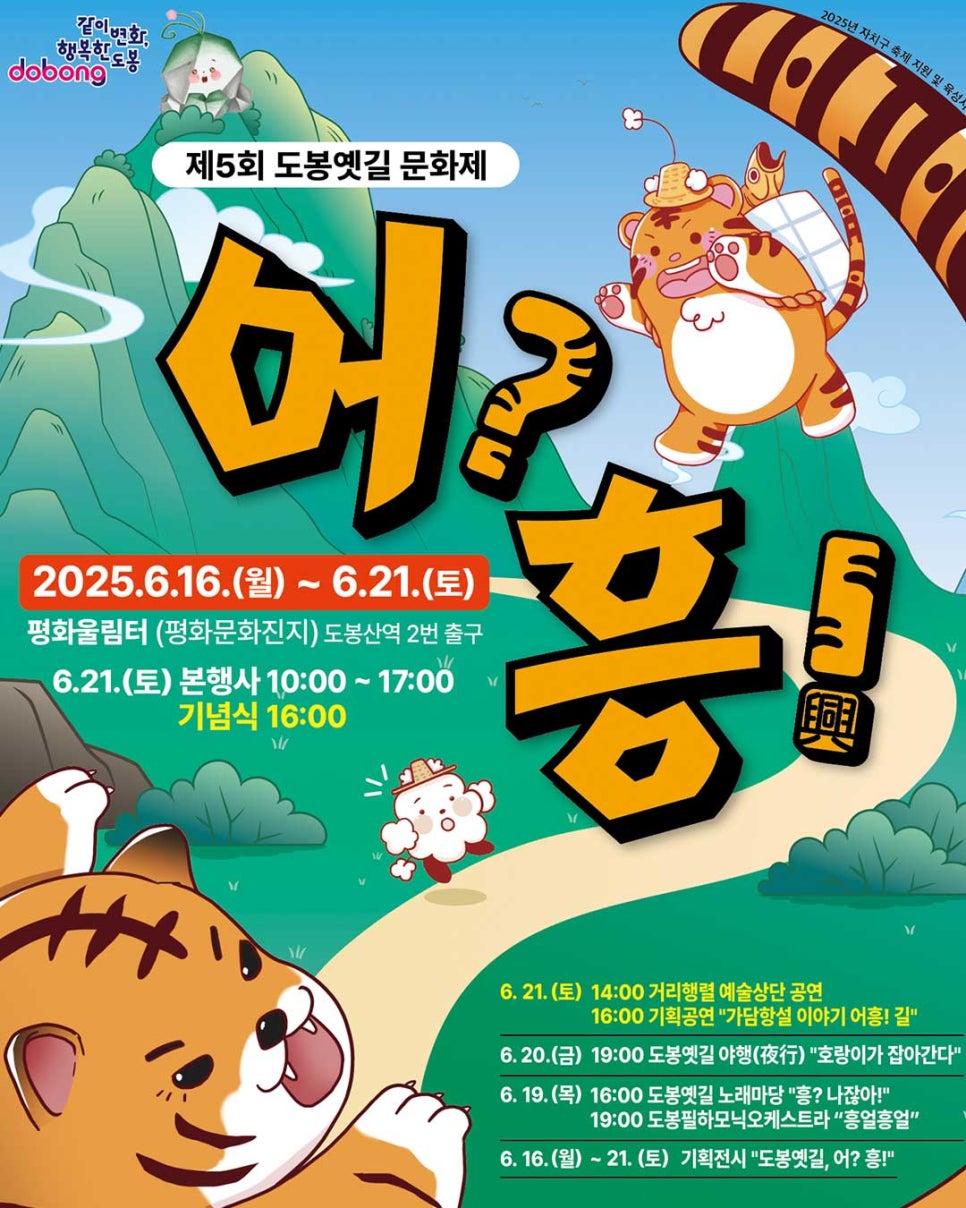 '도봉옛길'은 조선시대 수도 한양과 한반도 각 지방을 잇는 6대로 중 두 번째인 경흥대로의 도봉구 구간을 의미합니다. 오랜 역사와 이야기를 품고 있는 이 길에서, 오는 2025년 6월 16일(월)부터 6월 21일(토)까지 '제5회 도봉옛길 문화제 어? 흥(興)!'이 개최됩니다. 특히 본 행사는 6월 21일(토)에 집중적으로 진행됩니다. 나쁜 기운을 물리치는 도봉산 호랑이 '패랑이'와 함께 흥겨운 시간을 보낼 수 있는 이번 축제는 역사와 문화를 사랑하는 모든 이들에게 잊지 못할 추억을 선사할 것입니다.