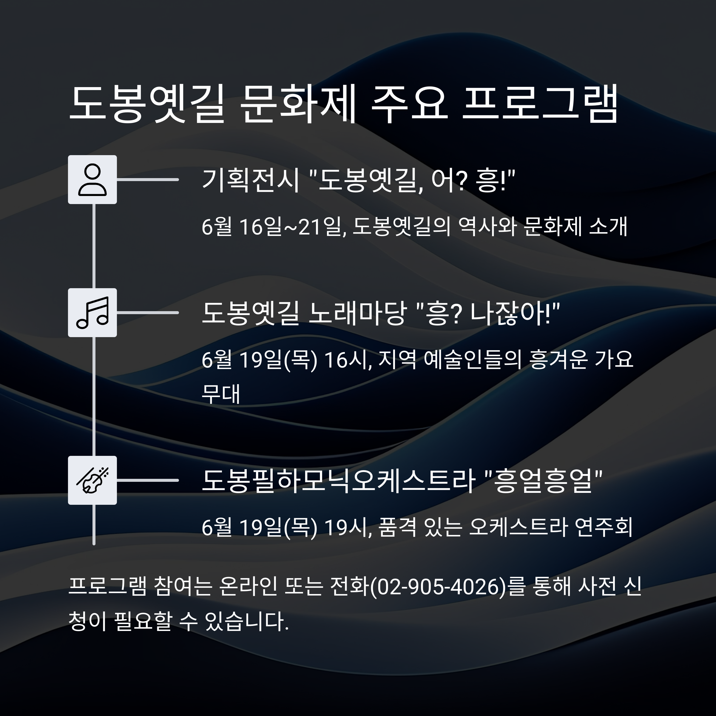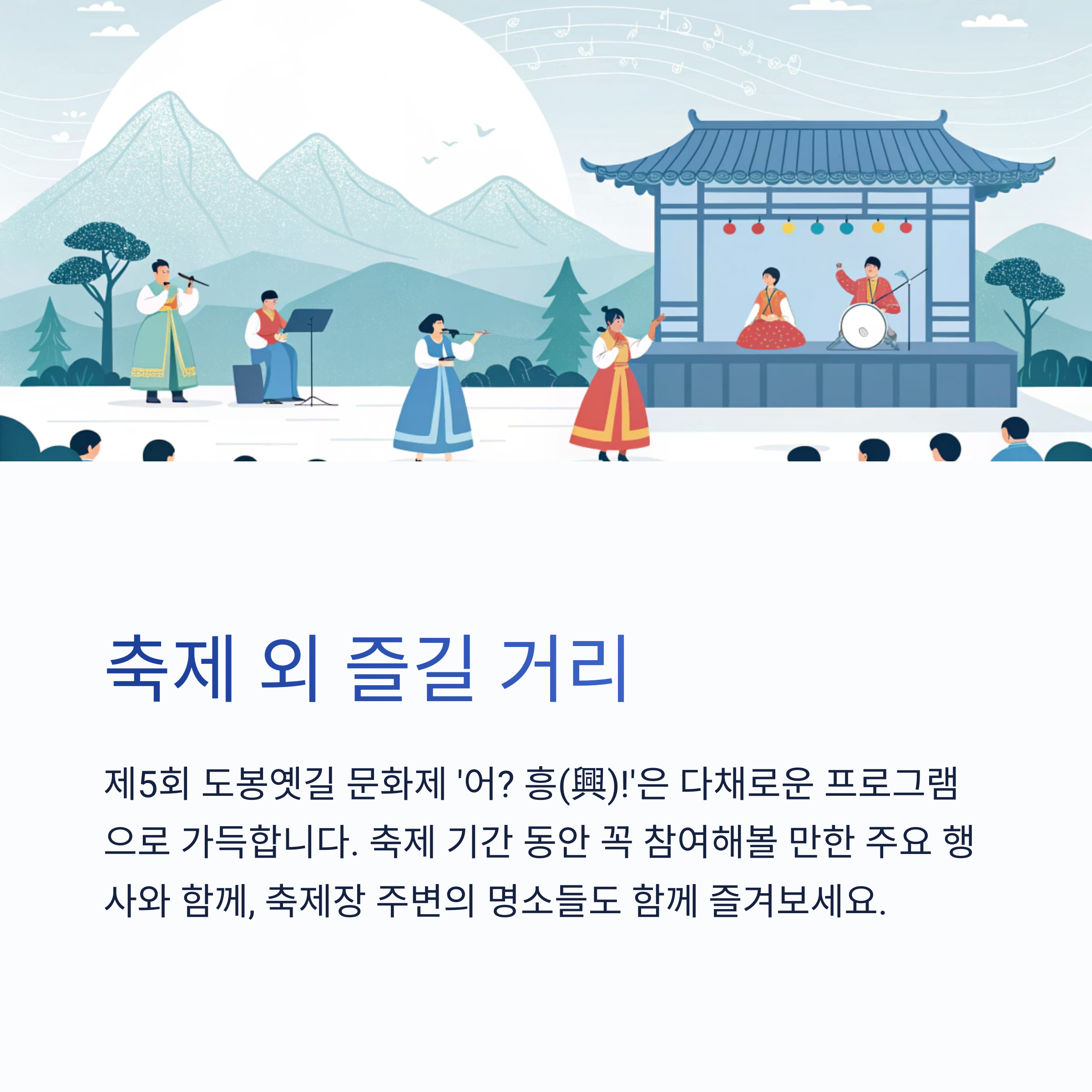 - 도봉옛길 노래마당 "흥? 나잖아!": 6월 19일(목) 16시에 지역 예술인들의 흥겨운 가요 무대가 펼쳐집니다. 함께 노래하며 축제의 흥을 돋워보세요.