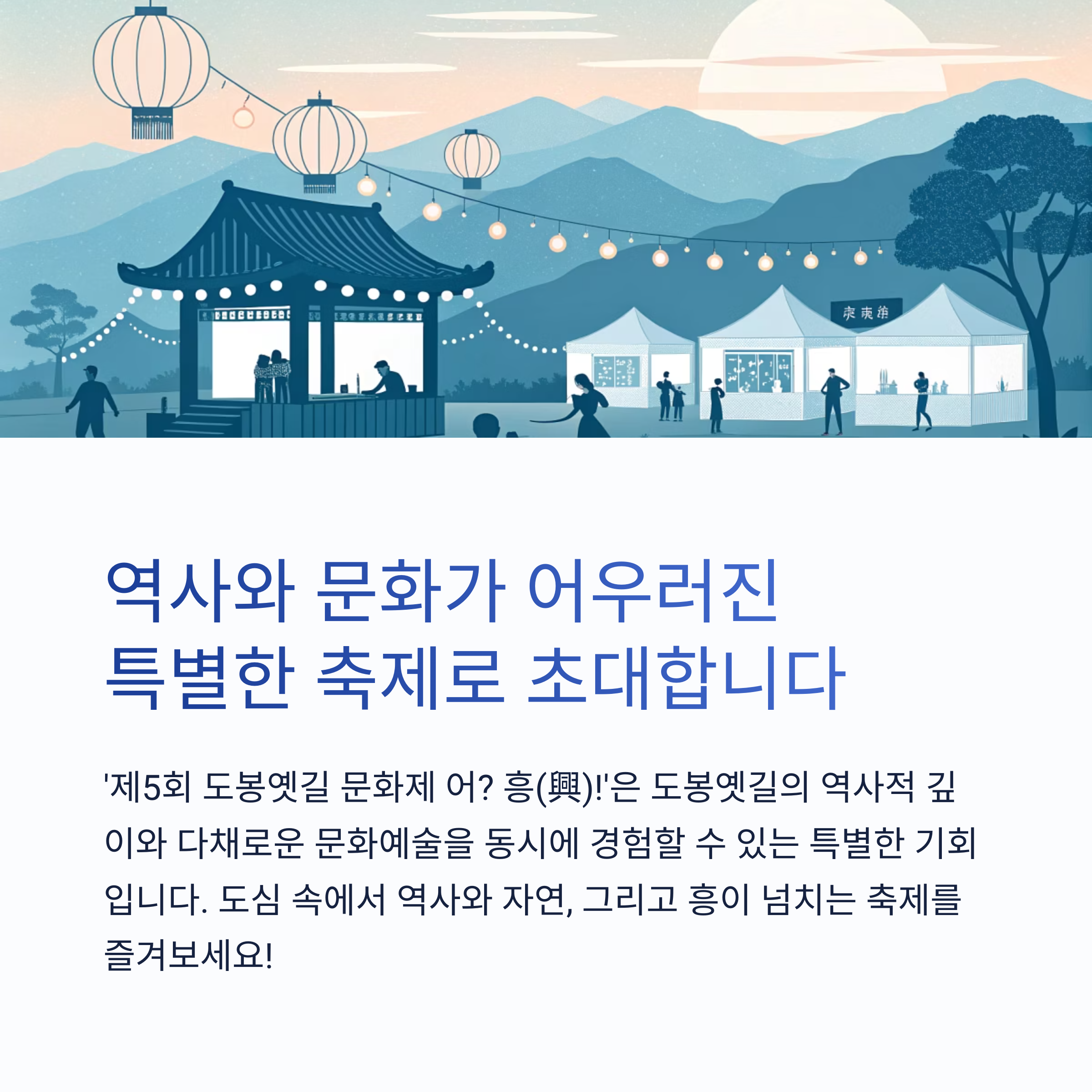 '제5회 도봉옛길 문화제 어? 흥(興)!'은 도봉옛길의 역사적 깊이와 다채로운 문화예술을 동시에 경험할 수 있는 특별한 기회입니다. 도심 속에서 역사와 자연, 그리고 흥이 넘치는 축제를 즐기고 싶다면, 이번 주말 도봉옛길 문화제로 떠나보는 건 어떠신가요?