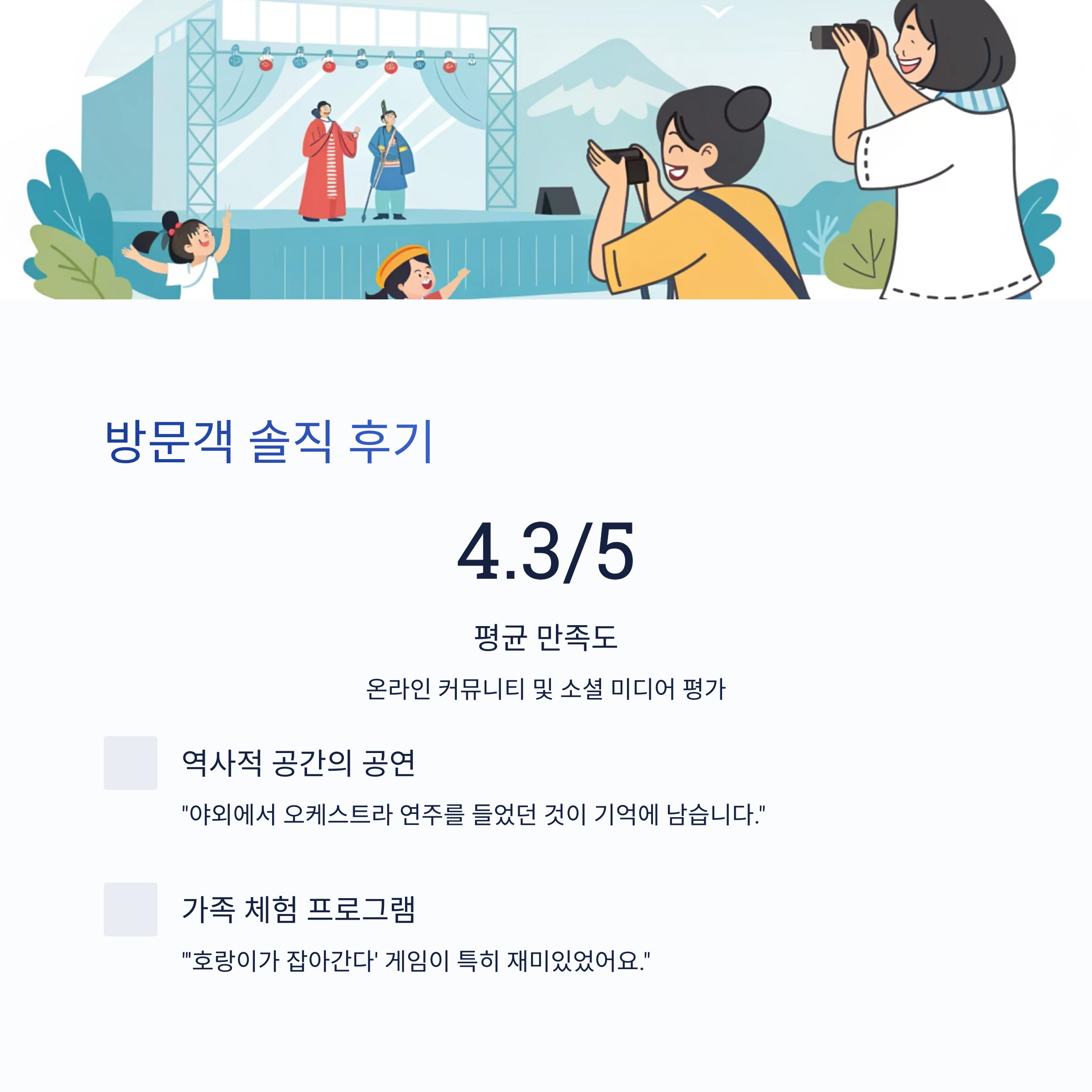 - "가족들과 함께 참여할 수 있는 체험 프로그램이 많아서 아이들이 정말 즐거워했습니다. '호랑이가 잡아간다' 게임이 특히 재미있었어요."