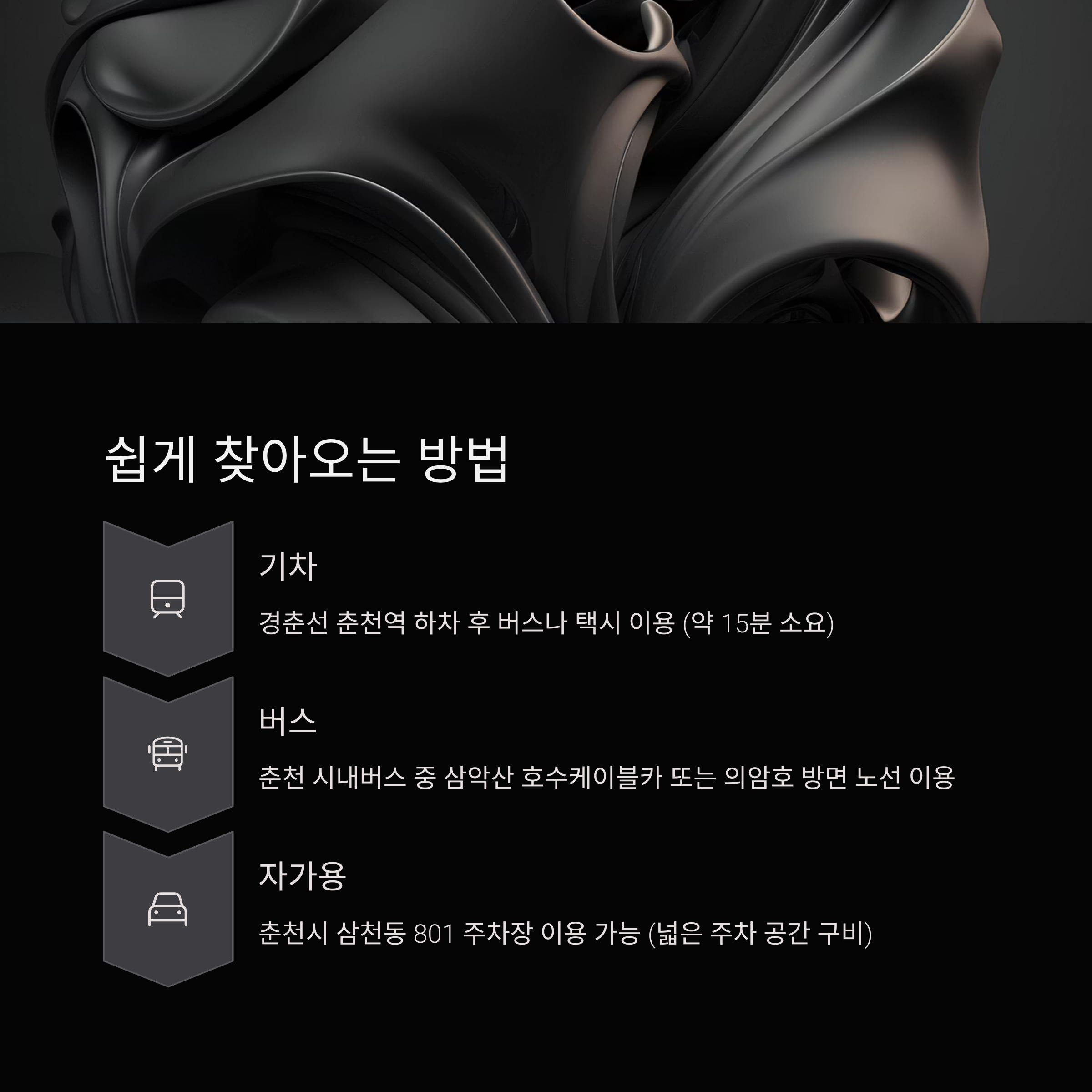 - 교통편: 춘천역에서 버스/택시 이용 또는 자차 이용 시 넓은 주차장을 활용할 수 있습니다.