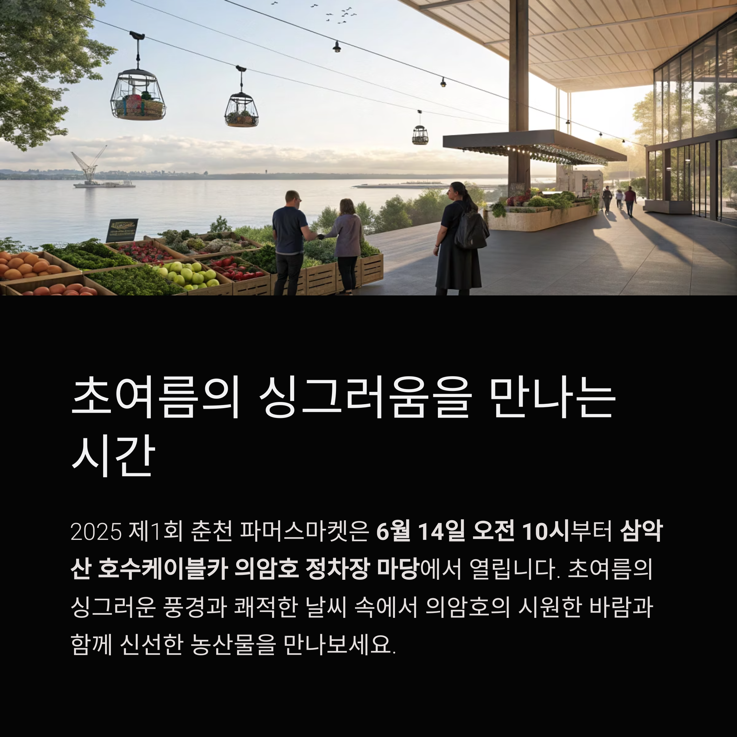 2025 제1회 춘천 파머스마켓은 **6월 14일 오전 10시**부터 **삼악산 호수케이블카 의암호 정차장 마당**에서 첫 장터를 엽니다. 6월 중순은 초여름의 싱그러운 풍경과 쾌적한 날씨가 어우러져 야외 활동을 즐기기에 매우 좋은 시기입니다. 의암호의 시원한 바람과 함께 신선한 농산물을 만나보세요.