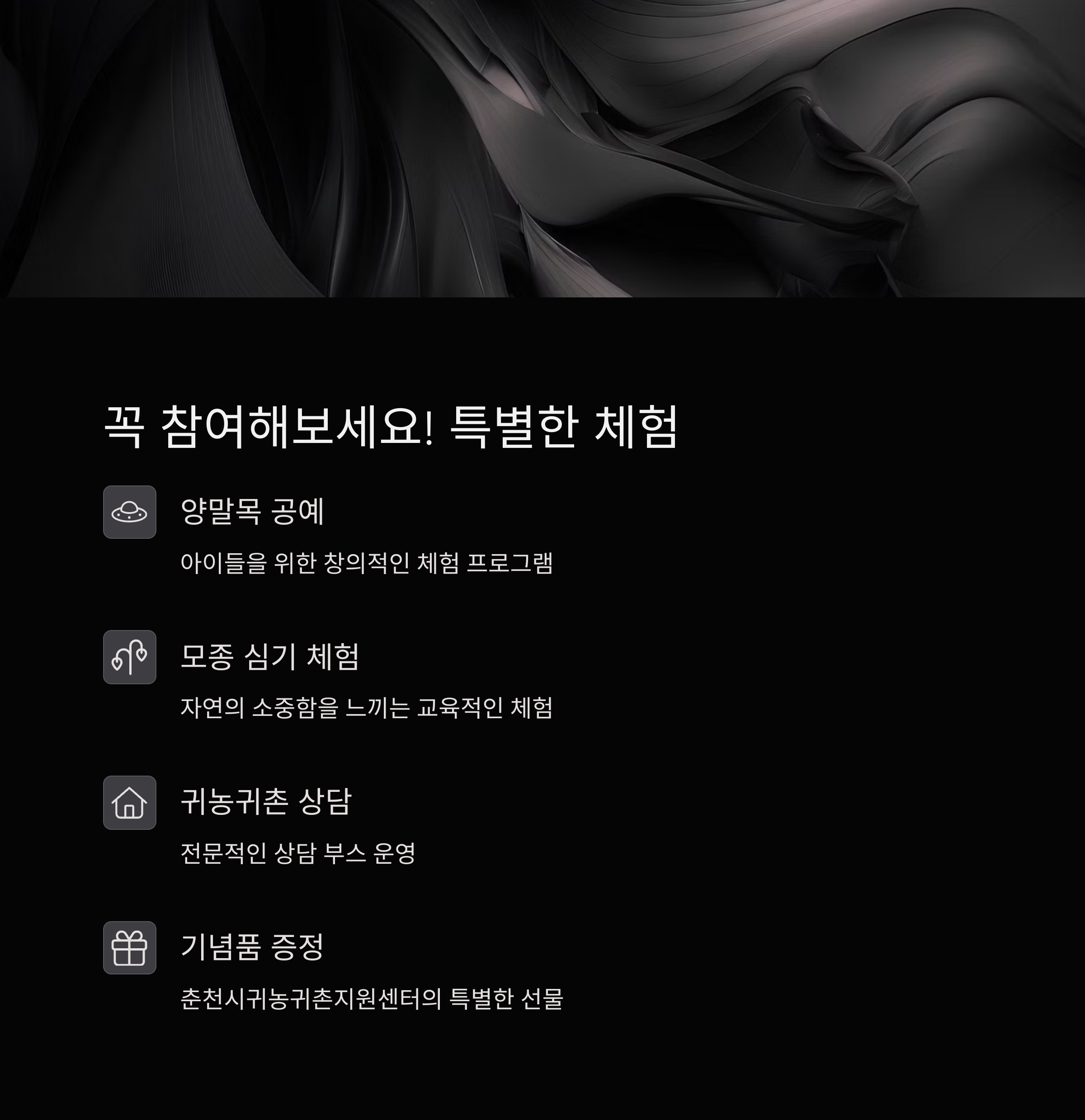 - 기념품 증정: 춘천시귀농귀촌지원센터에서 준비한 특별한 기념품을 받을 수 있습니다.