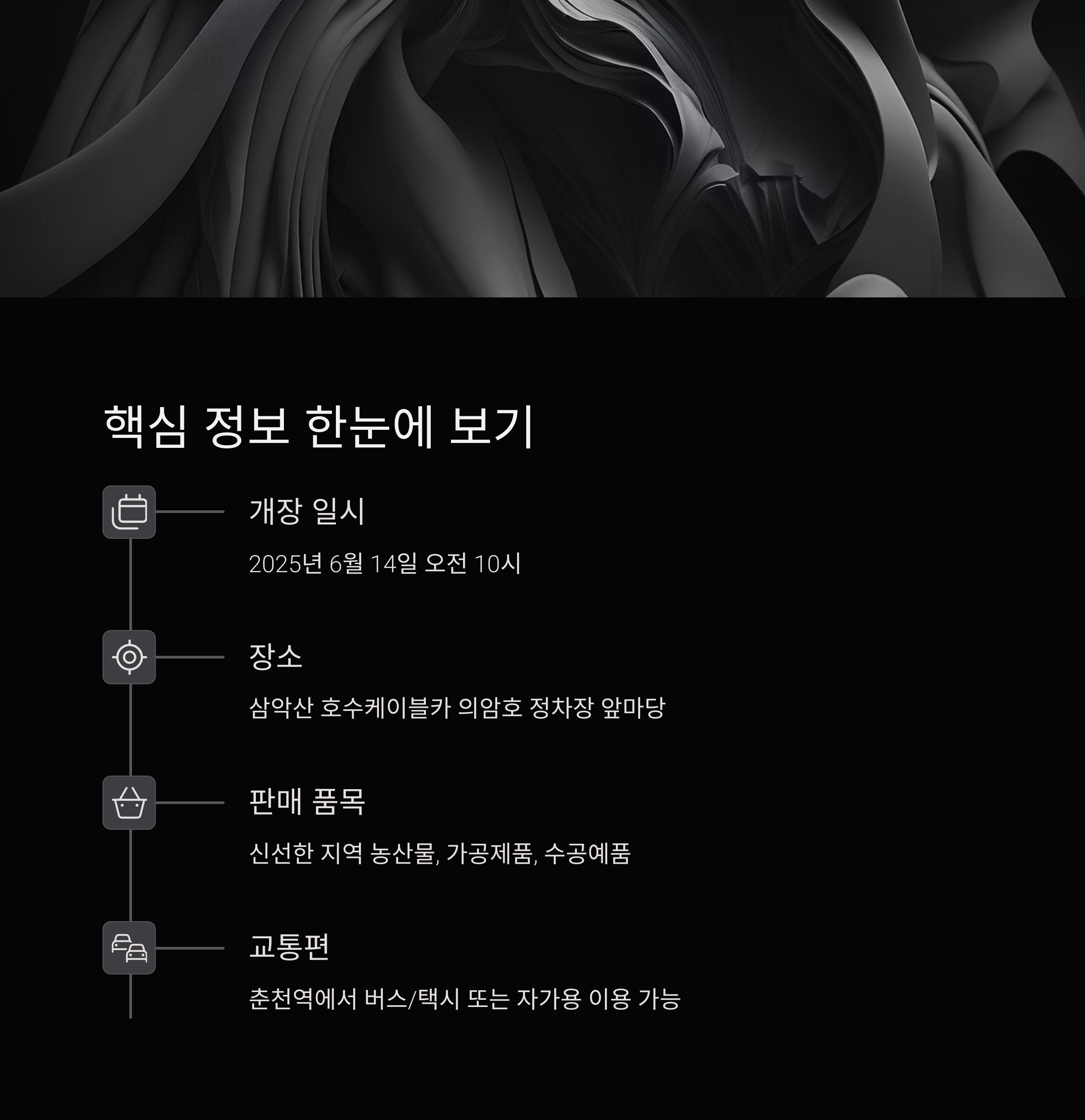 - 개장 시기 및 장소: 2025년 6월 14일 오전 10시, 삼악산 호수케이블카 의암호 정차장 앞마당(강원특별자치도 춘천시 삼천동 801)에서 첫 장터가 열립니다.