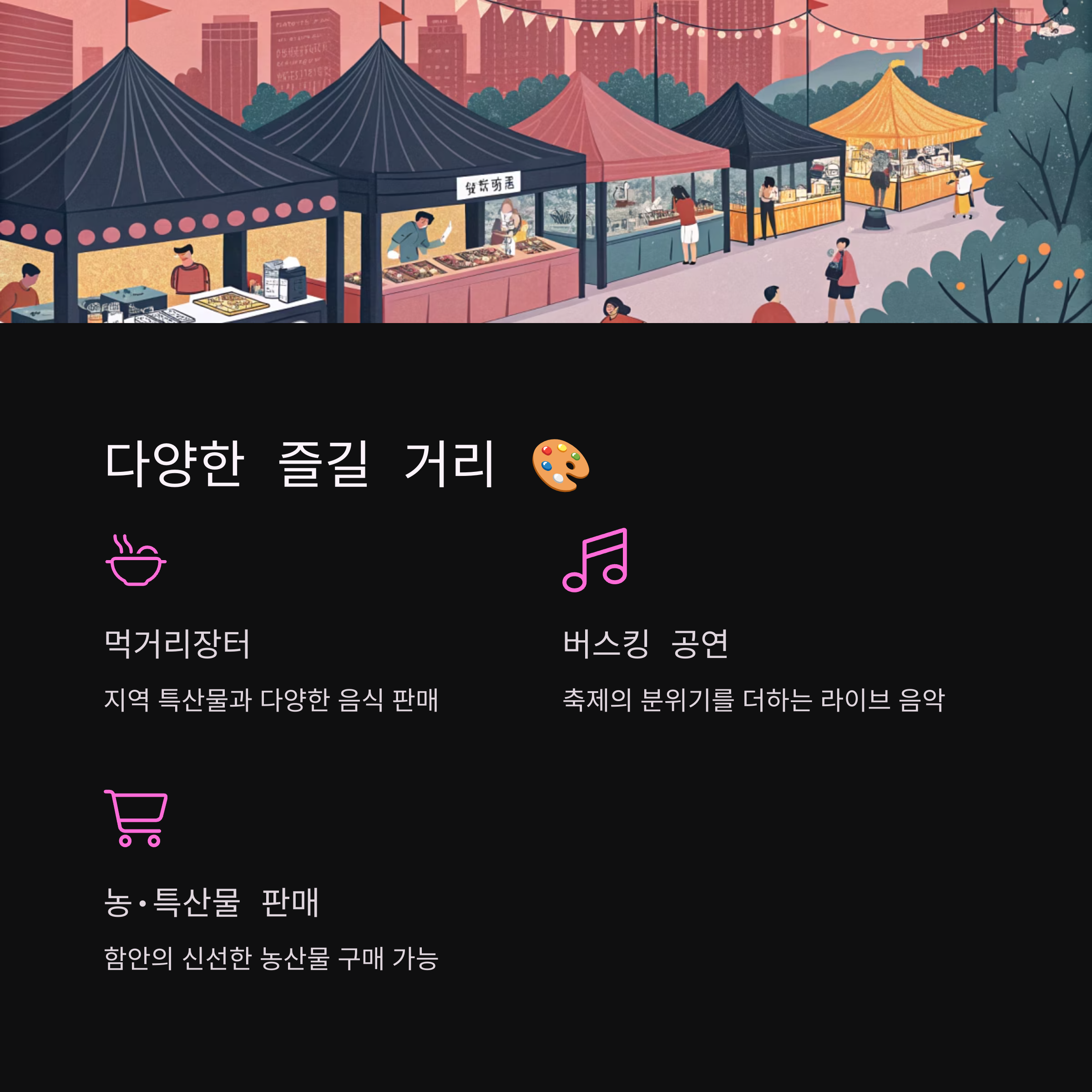 해바라기 축제는 단순한 꽃 구경을 넘어 다양한 즐길 거리를 제공합니다. 축제장 내에서는 **농·특산물 판매장**이 운영되어 함안의 신선한 농산물을 직접 구매할 수 있고, **먹거리장터와 푸드트럭**에서 맛있는 음식들을 맛볼 수 있습니다. 또한, 방문객들의 흥을 돋우는 **버스킹 공연**도 수시로 진행되어 축제의 활기를 더합니다.
