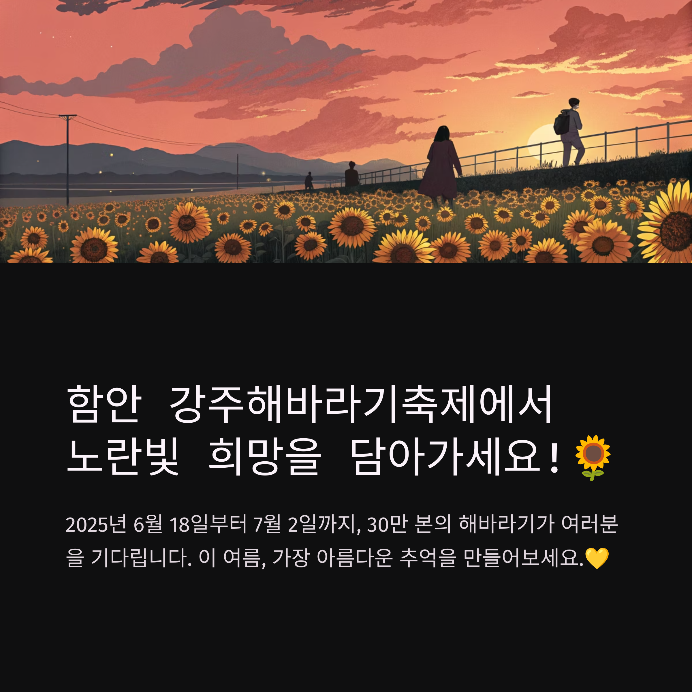 함안 강주해바라기축제에서 소중한 추억을 만들고, 노란빛 희망을 가득 담아가시길 바랍니다! 🌻✨