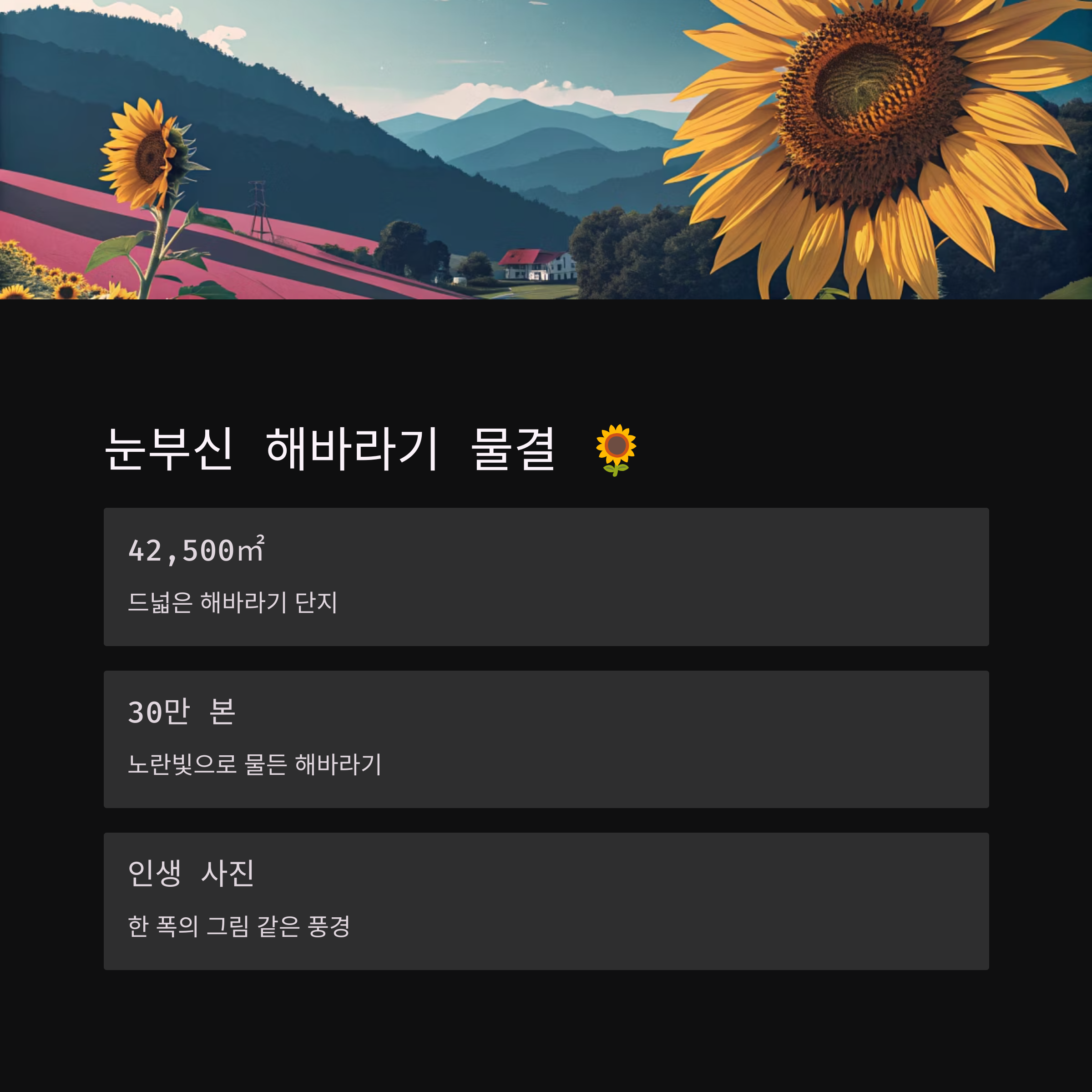 - "해바라기 밭 규모가 정말 엄청나요! 사진 찍기 너무 좋았어요. 노란색 물결이 끝없이 펼쳐져서 감동적이었습니다."