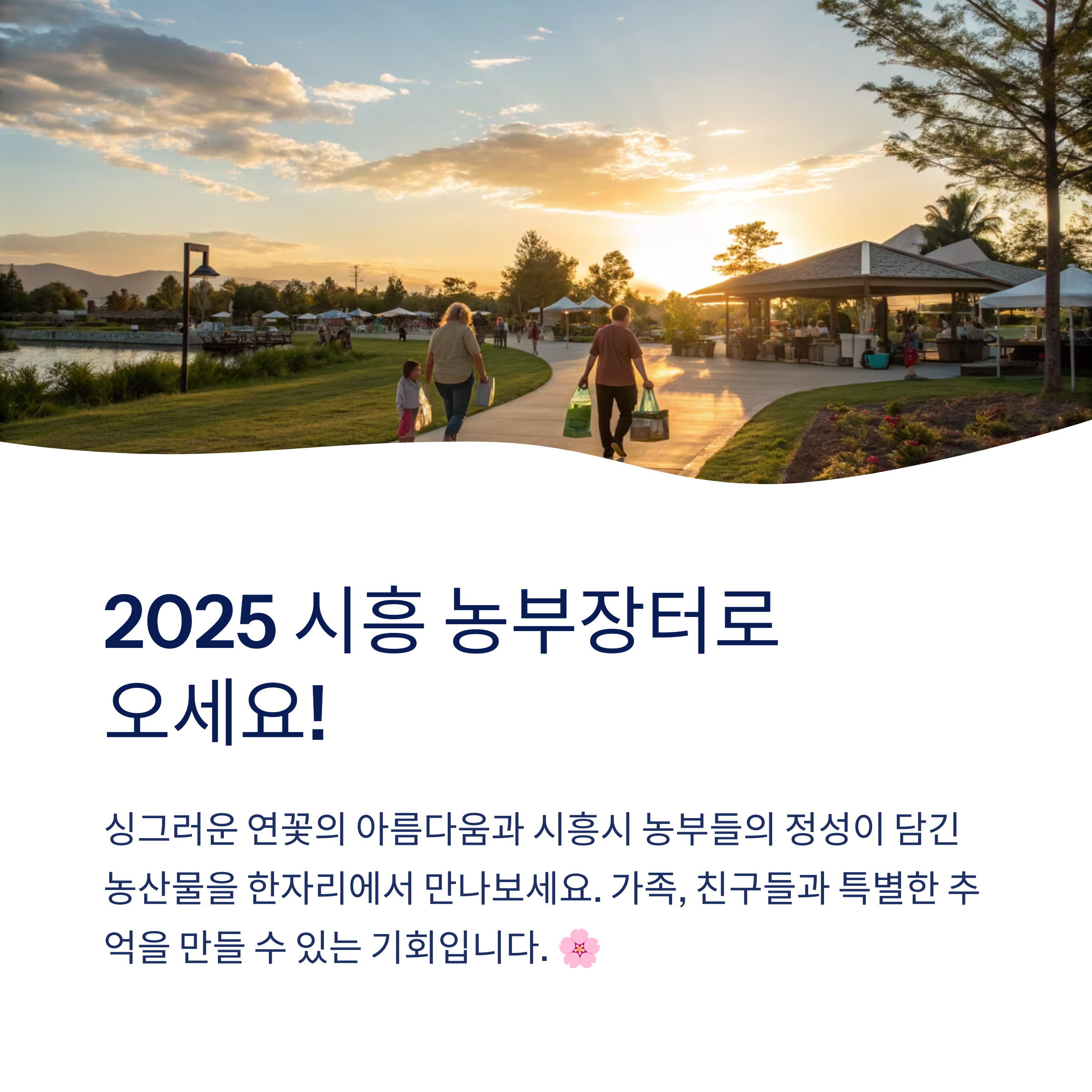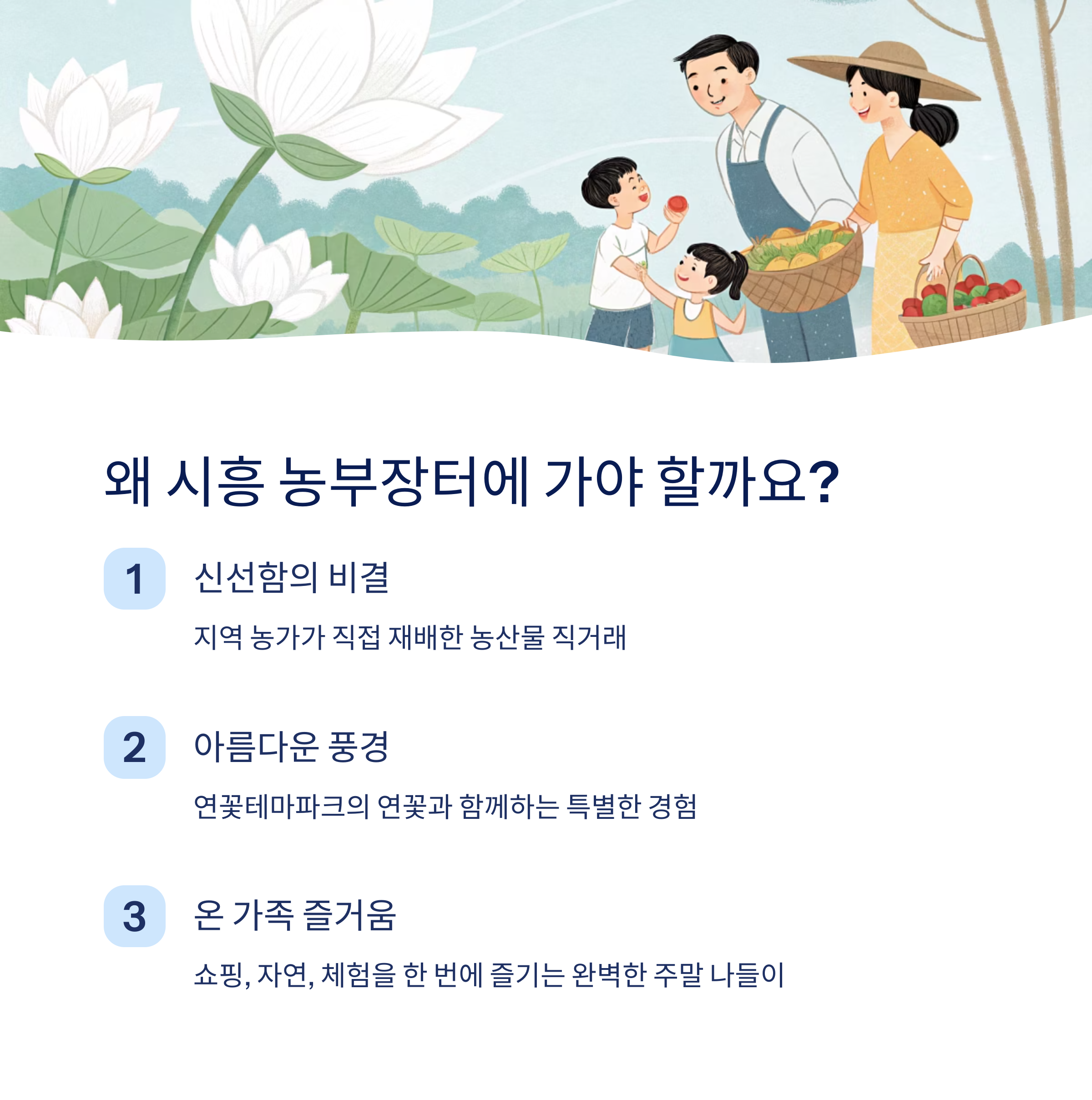 싱그러운 연꽃의 아름다움과 시흥시 농부들의 정성이 담긴 농산물을 한자리에서 만날 수 있는 '2025 시흥시 농부장터'는 가족, 친구들과 함께 특별한 추억을 만들 수 있는 기회가 될 것입니다. 주말 나들이 장소를 고민 중이라면, 지금 바로 시흥시 농부장터를 방문해 보세요!