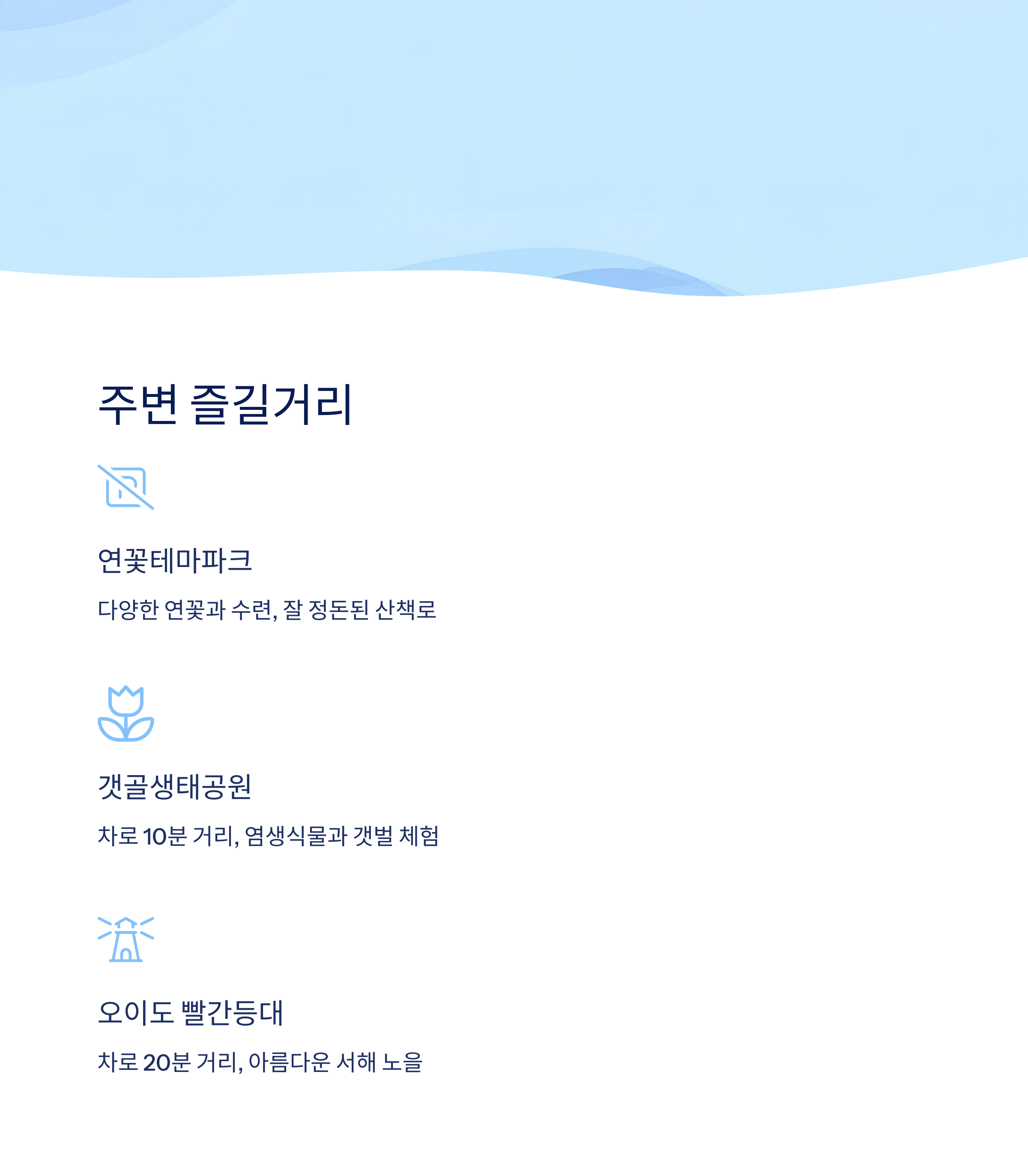 - 갯골생태공원: 차량으로 약 10분 거리에 위치한 갯골생태공원은 염생식물과 갯벌 생물을 만날 수 있는 자연 친화적인 공간입니다. 갯벌 체험, 염전 체험 등 다양한 프로그램에 참여할 수 있으며, 흔들 전망대에서 바라보는 갯골의 풍경은 특히 아름답습니다.