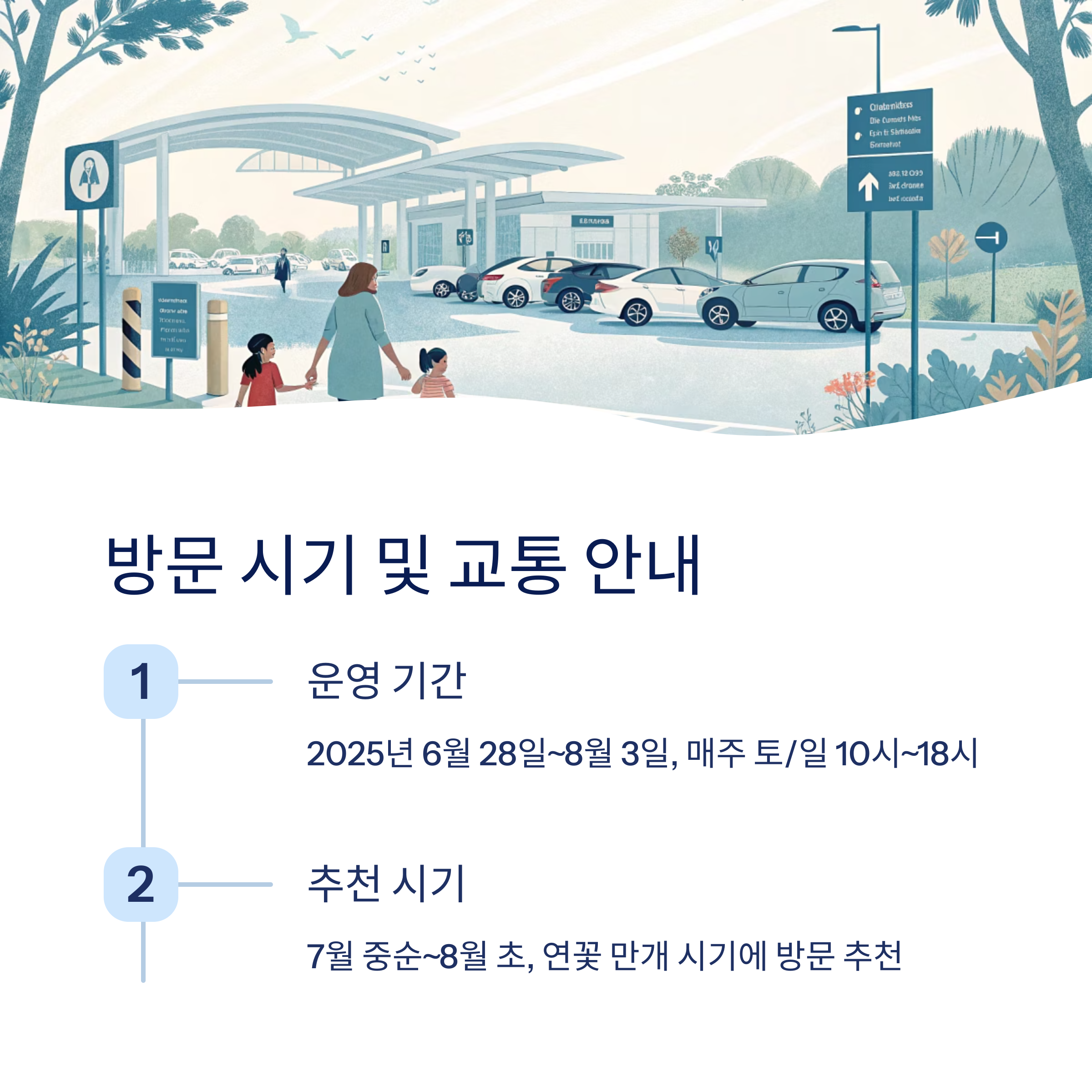 연꽃테마파크 내에 넓은 주차 공간이 마련되어 있어 편리하게 이용할 수 있습니다. 주말에는 다소 혼잡할 수 있으니, 이른 시간 방문을 추천합니다.