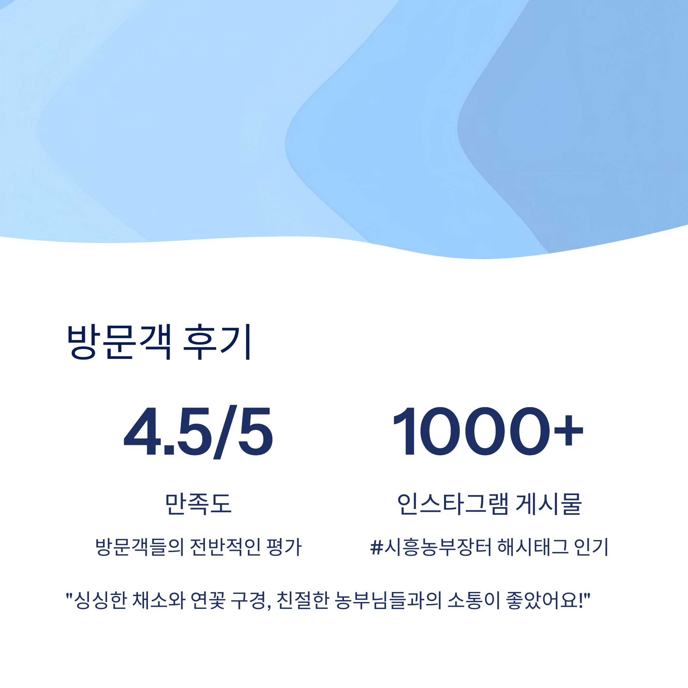 인스타그램 #시흥농부장터 해시태그 게시물은 현재 1,000건 이상으로, 방문객들의 활발한 관심과 참여를 엿볼 수 있습니다. 농부장터는 시흥시의 대표적인 주말 나들이 명소로 자리매김하고 있습니다.