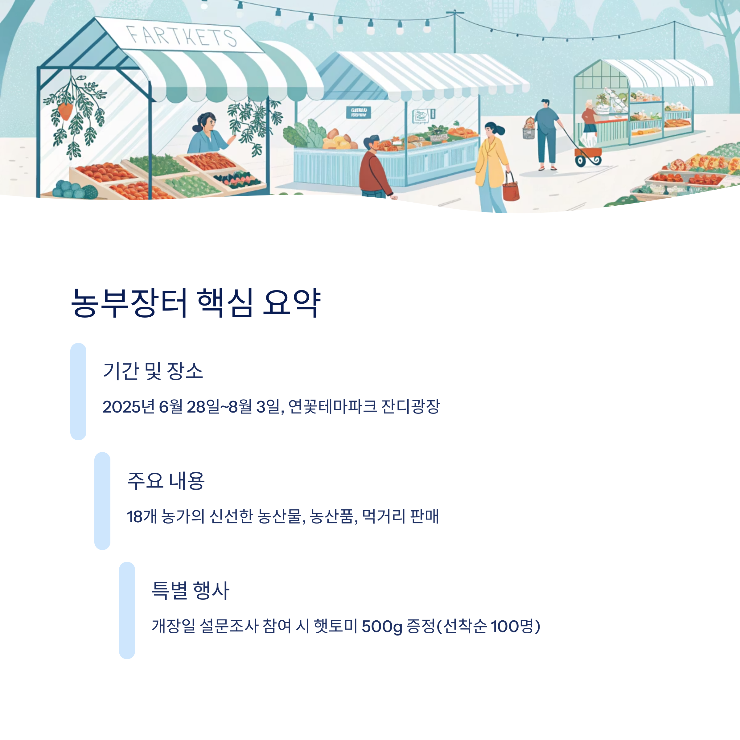 - 특별 행사: 개장일(6월 28일) 설문조사 참여 시 햇토미 500g 증정 (선착순 100명), 추첨을 통한 농산물 증정