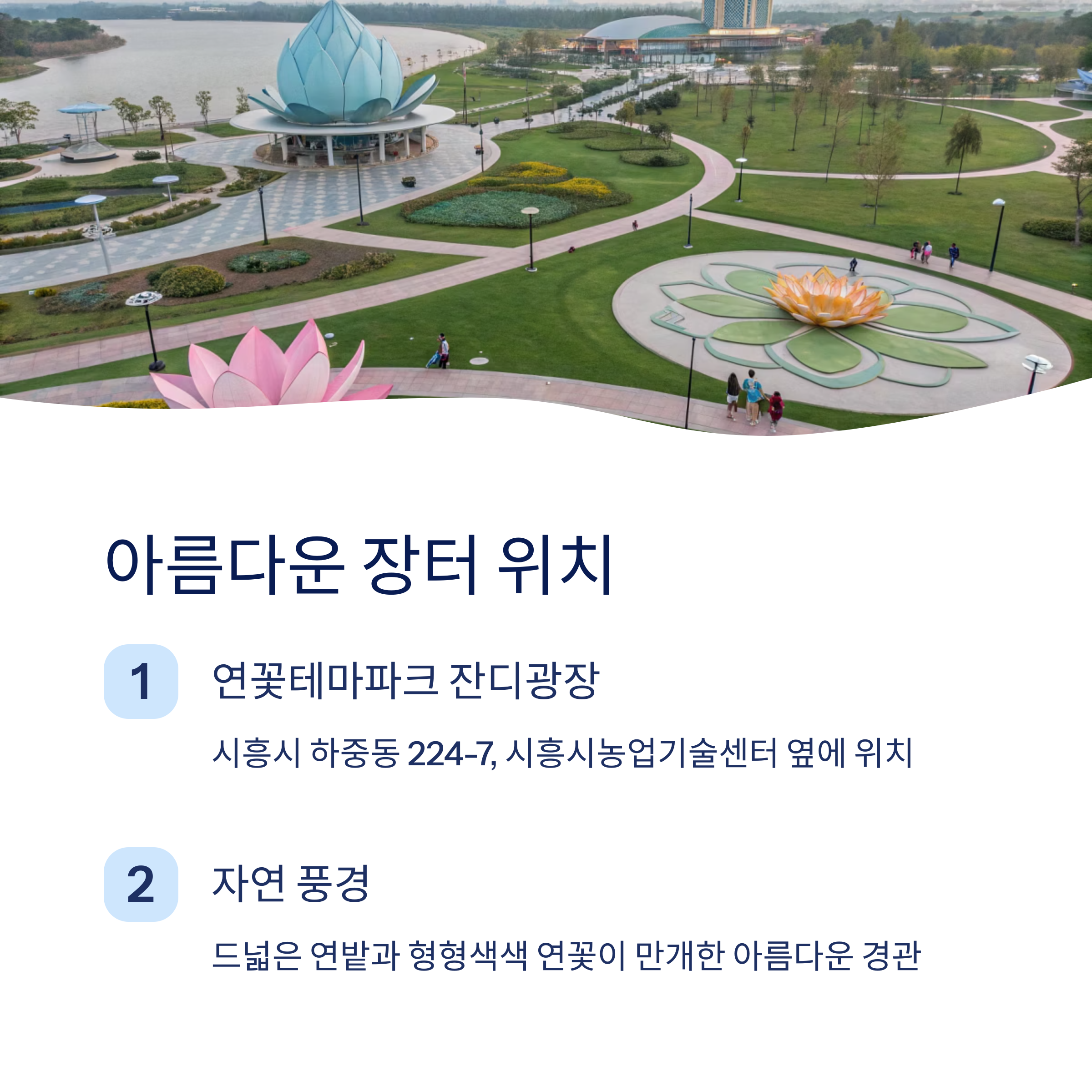 2025 시흥시 농부장터는 시흥시 하중동 224-7에 위치한 연꽃테마파크 잔디광장(시흥시농업기술센터 옆)에서 열립니다. 이곳은 드넓은 연밭이 장관을 이루는 곳으로, 여름철에는 형형색색의 연꽃이 만개하여 방문객들에게 아름다운 자연 풍경을 선사합니다. 장터가 열리는 잔디광장 주변으로는 산책로가 잘 조성되어 있어 신선한 공기를 마시며 여유로운 시간을 보낼 수 있습니다. 고즈넉한 연못과 푸른 잔디밭이 어우러져 평화롭고 한적한 분위기를 느낄 수 있는 것이 특징입니다.