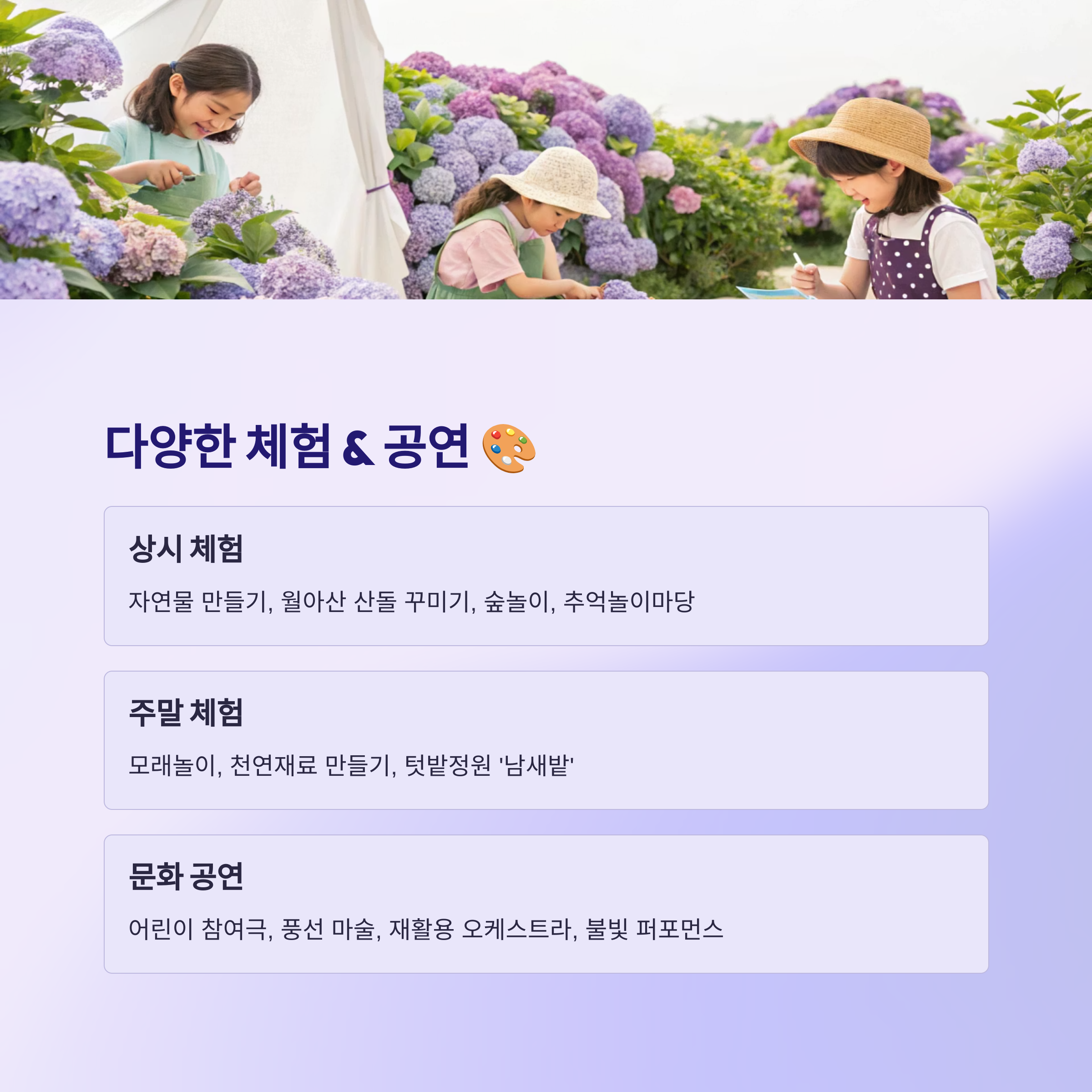 - 전시: 종류별 수국 전시, 지역 작가 그림 전시, 솟대&장승 전시, 그림책 원화 전시 등을 통해 예술과 자연이 어우러진 공간을 만날 수 있습니다.