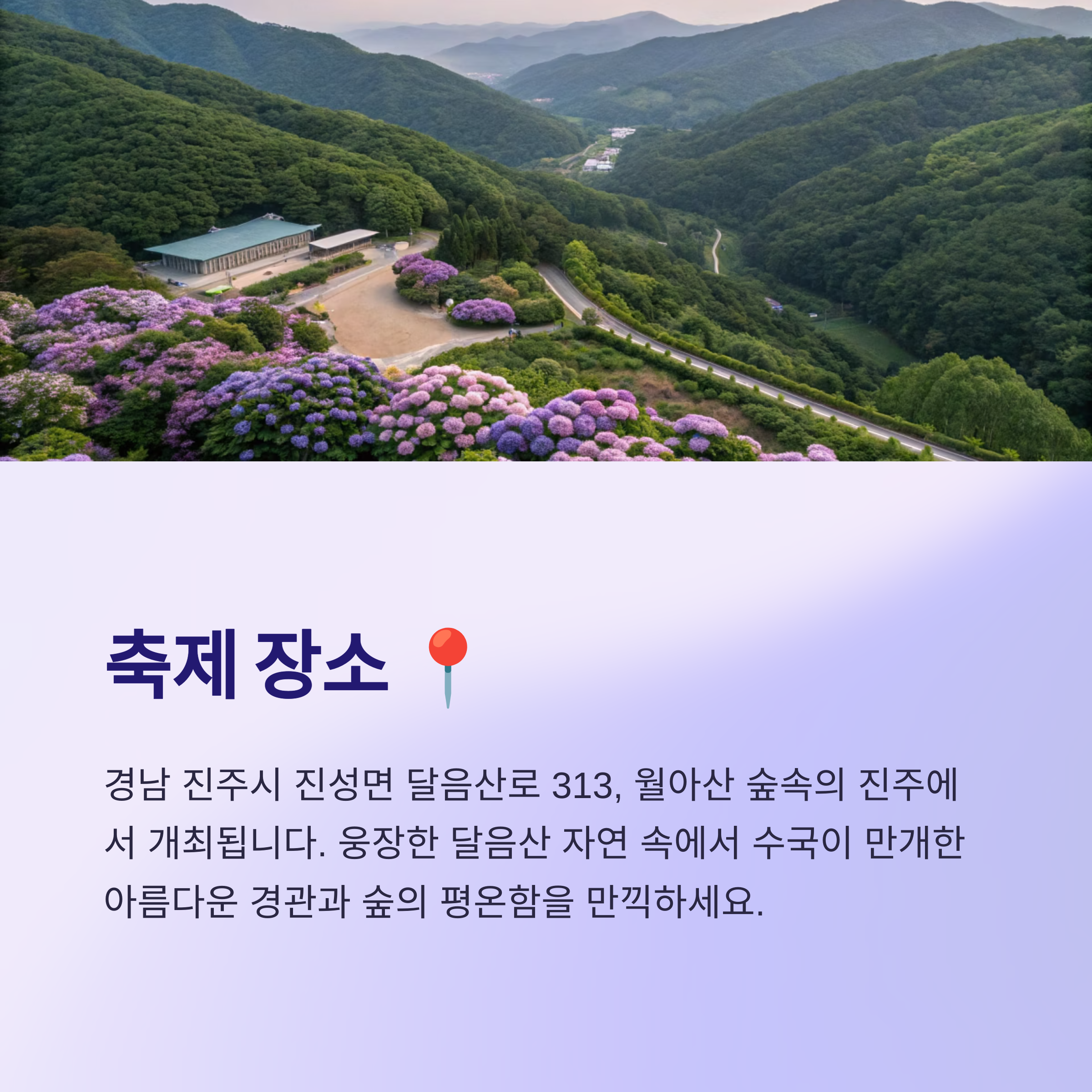 2025 월아산 수국 페스티벌은 경남 진주시 진성면 달음산로 313, 월아산 숲속의 진주 일원에서 개최됩니다. 이곳은 달음산의 웅장한 자연 속에 자리 잡고 있어, 방문객들은 수국이 만개한 아름다운 경관과 함께 숲이 주는 평온함을 만끽할 수 있습니다. 주변에는 푸른 숲과 맑은 공기가 가득하여 도심 속 번잡함에서 벗어나 진정한 힐링을 경험하기에 최적의 장소입니다.