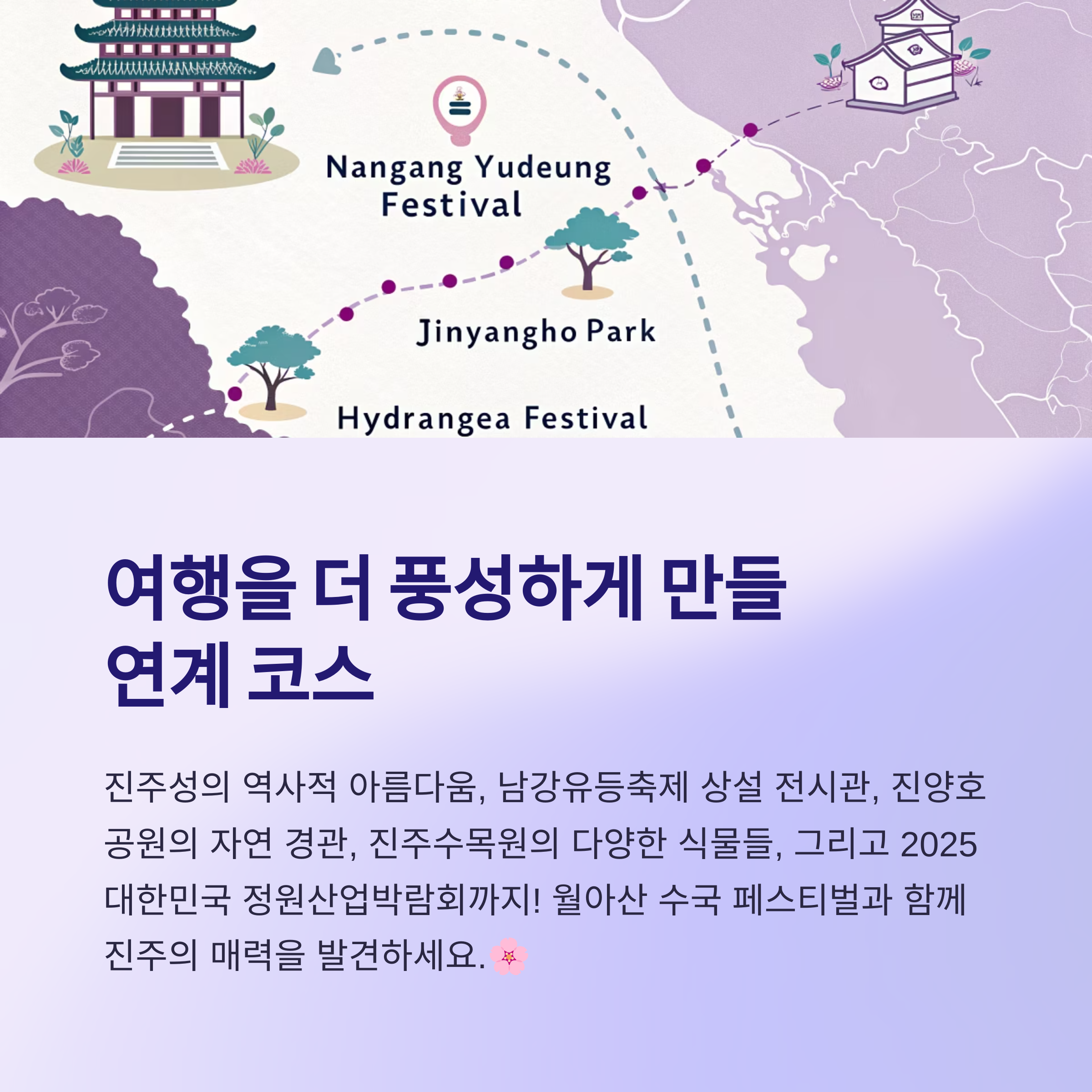 월아산 수국 페스티벌을 시작으로 진주의 매력을 곳곳에서 찾아보며 잊지 못할 추억을 만들어보시기 바랍니다.