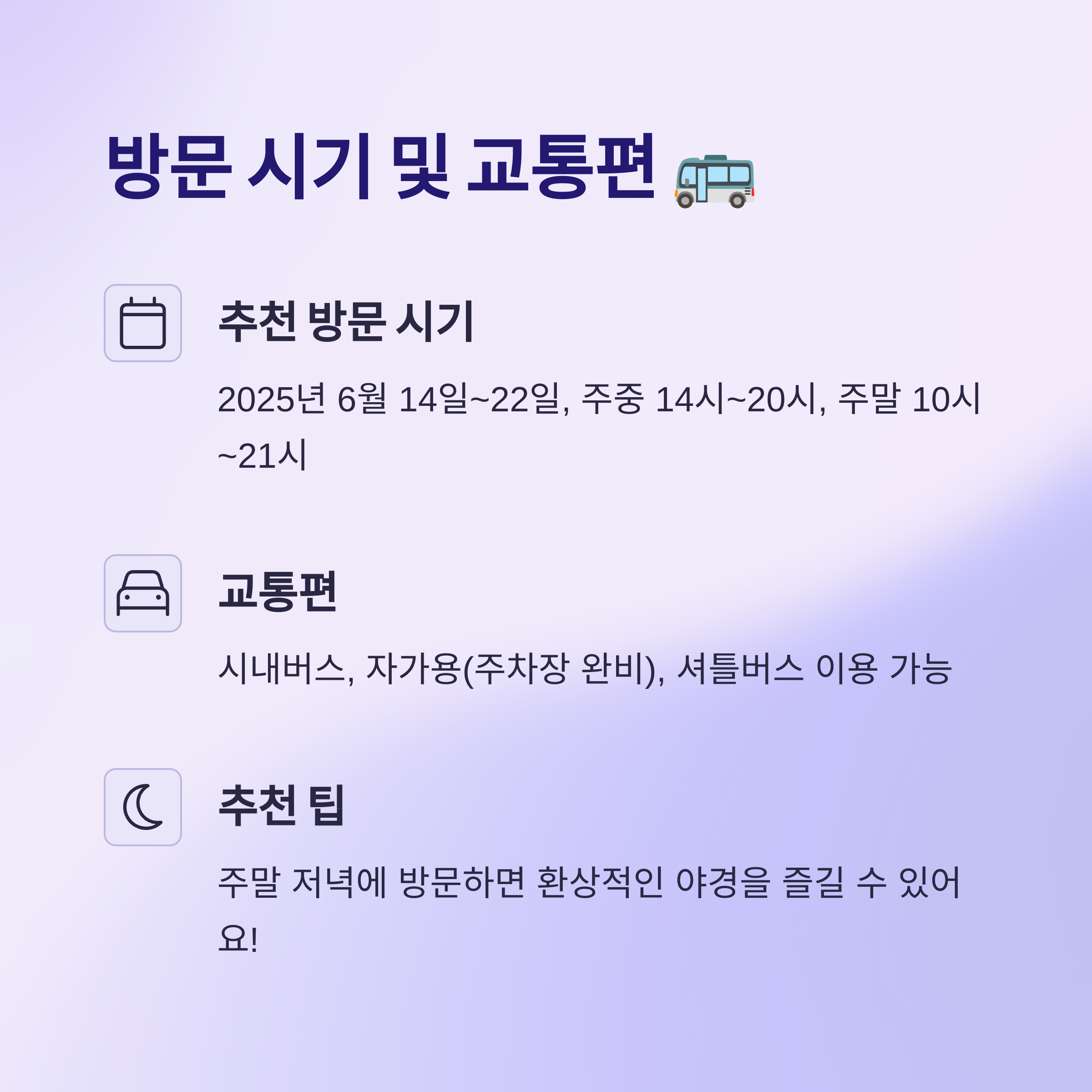 - 추천 방문 시기: 축제는 2025년 6월 14일(토)부터 6월 22일(일)까지 진행됩니다. 수국이 가장 아름답게 만개하는 이 시기에 맞춰 방문하시면 최고의 꽃구경을 즐길 수 있습니다. 주중에는 오후 2시부터 8시까지, 주말에는 오전 10시부터 오후 9시까지 운영되니, 방문 계획에 참고하시기 바랍니다. 특히 밤에는 진주의 유등과 조명을 활용한 환상적인 야경이 펼쳐지니, 주말 저녁 방문을 강력 추천합니다.