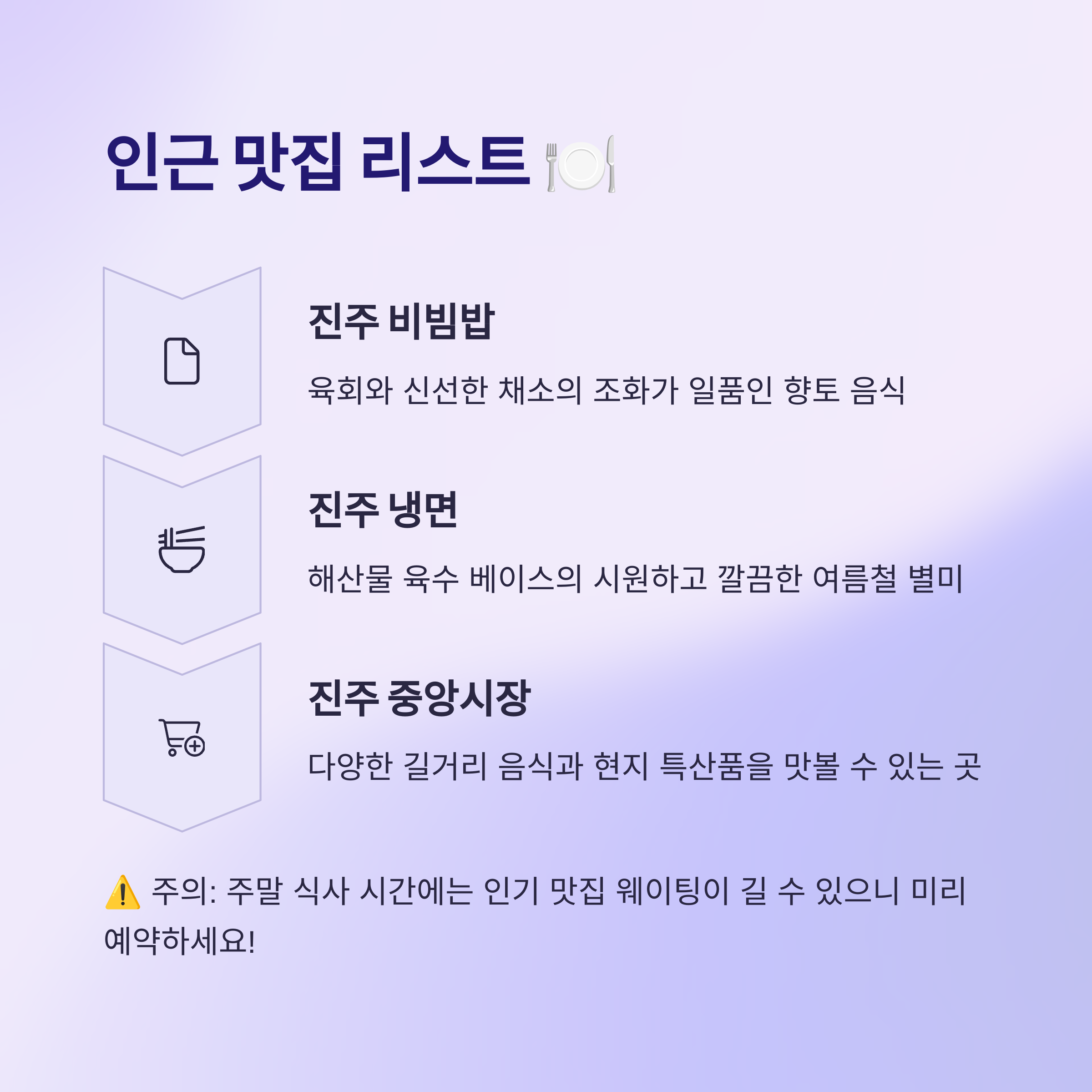 - 진주 냉면 맛집: 해산물 육수 베이스의 시원하고 깔끔한 맛이 특징인 진주 냉면은 여름철 별미로 손꼽힙니다.