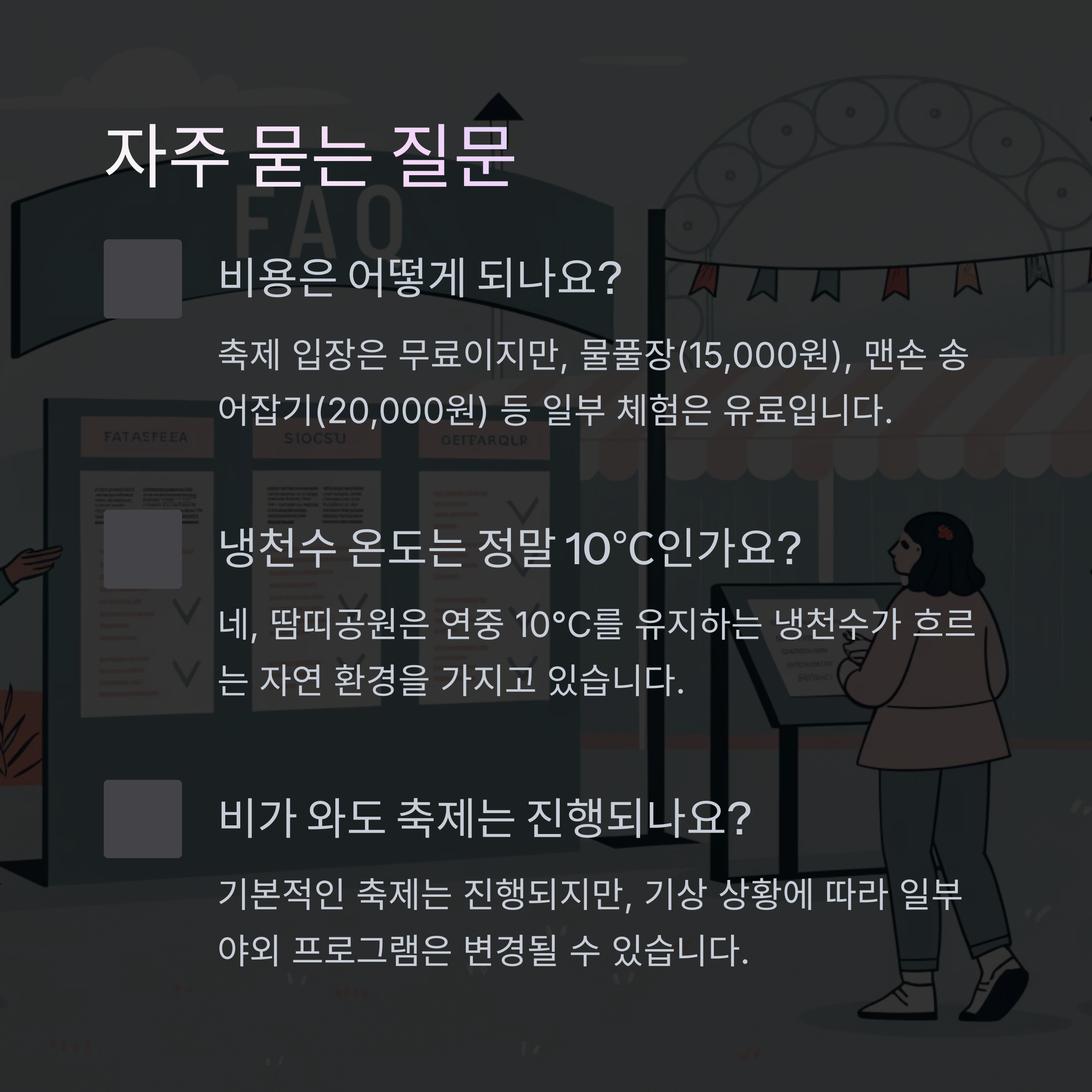 - 특징: 연중 10℃ 냉천수, 다채로운 체험 및 먹거리, 가족 단위 추천