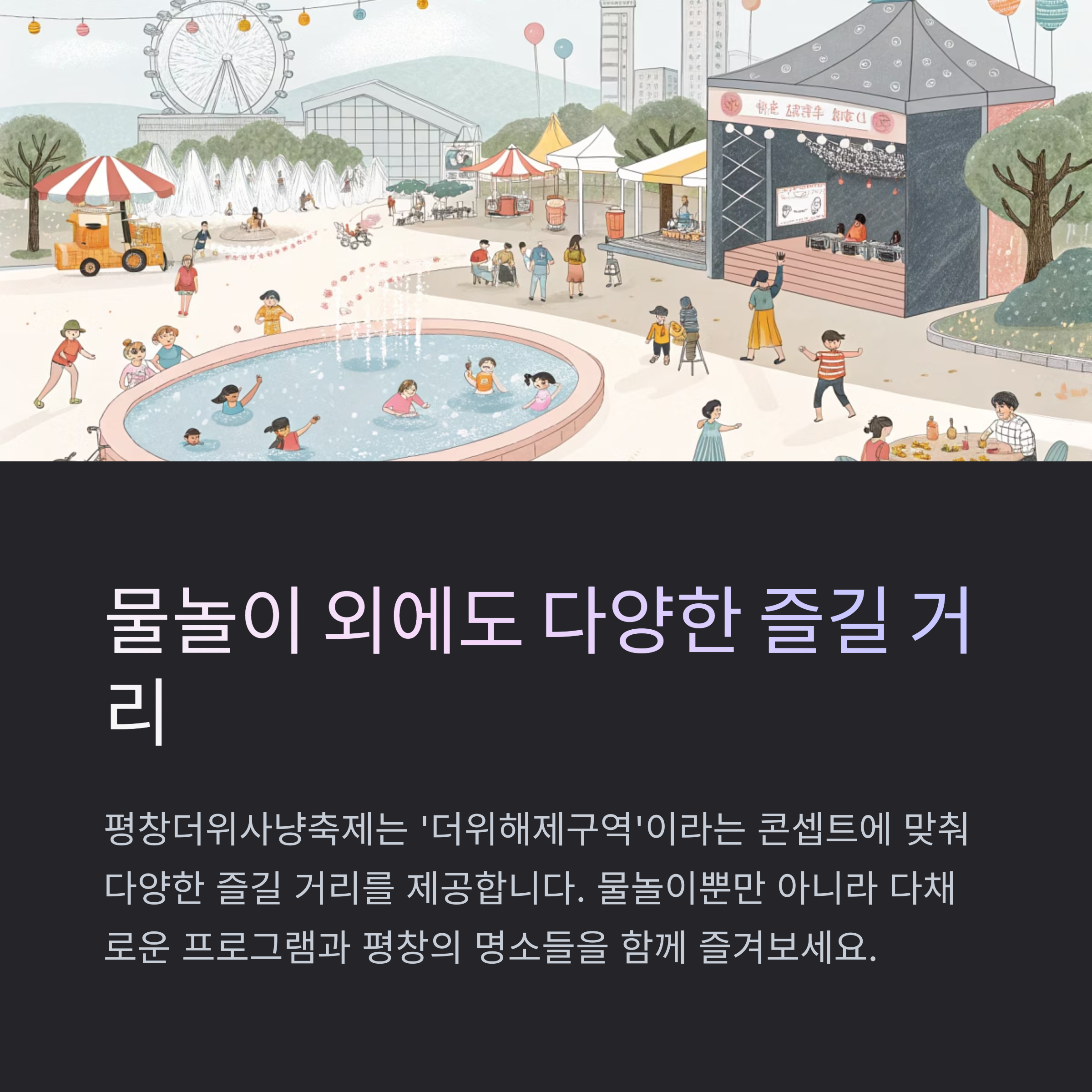 평창더위사냥축제는 물놀이 외에도 '더위해제구역'이라는 콘셉트에 맞춰 다양한 즐길 거리를 제공합니다. 주요 프로그램과 함께 평창의 다른 명소들도 둘러보며 더욱 풍성한 여름 휴가를 계획해 보세요.