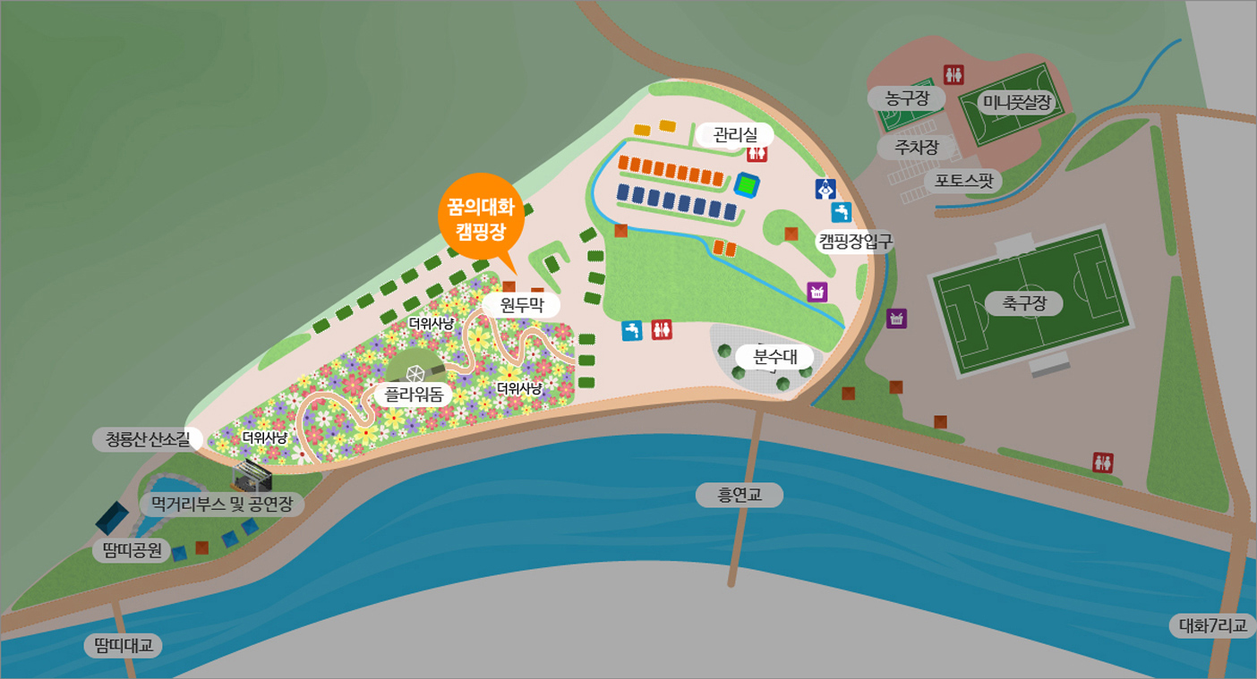 평창더위사냥축제는 강원도 평창군 대화면 더위사냥축제장 일원에서 진행됩니다. 핵심 장소인 땀띠공원은 주변이 울창한 숲과 맑은 계곡으로 둘러싸여 있어, 축제에 참여하면서 동시에 평창의 아름다운 자연경관을 만끽할 수 있습니다. 특히, 냉천수가 흐르는 땀띠공원의 시원한 분위기는 한여름 더위를 잊게 하는 최적의 장소입니다. 축제장은 대화면 시가지와 인접하여 접근성이 좋으며, 주변 상점과 연계하여 편리하게 이용할 수 있습니다.
