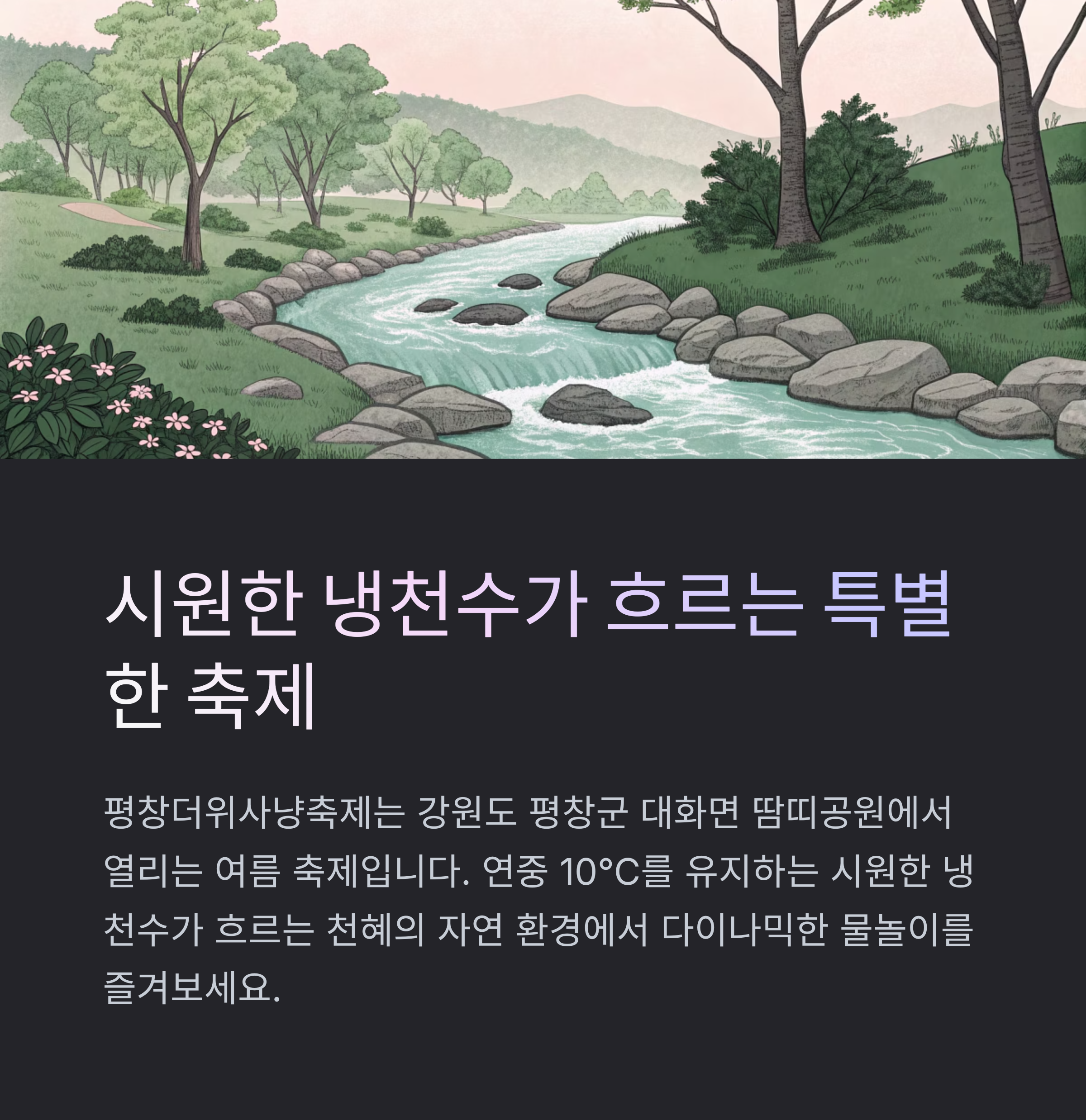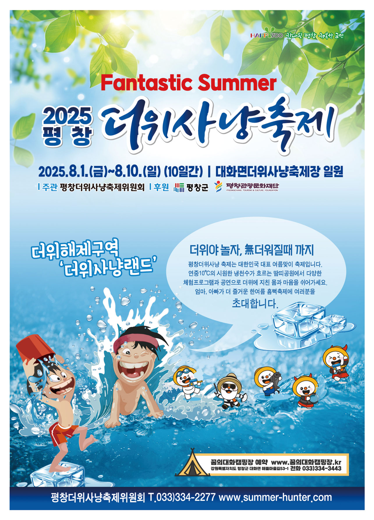 - 시기 및 장소: 2025년 8월 1일~10일, 평창 대화면 땀띠공원 일원 (연중 10℃ 냉천수).
