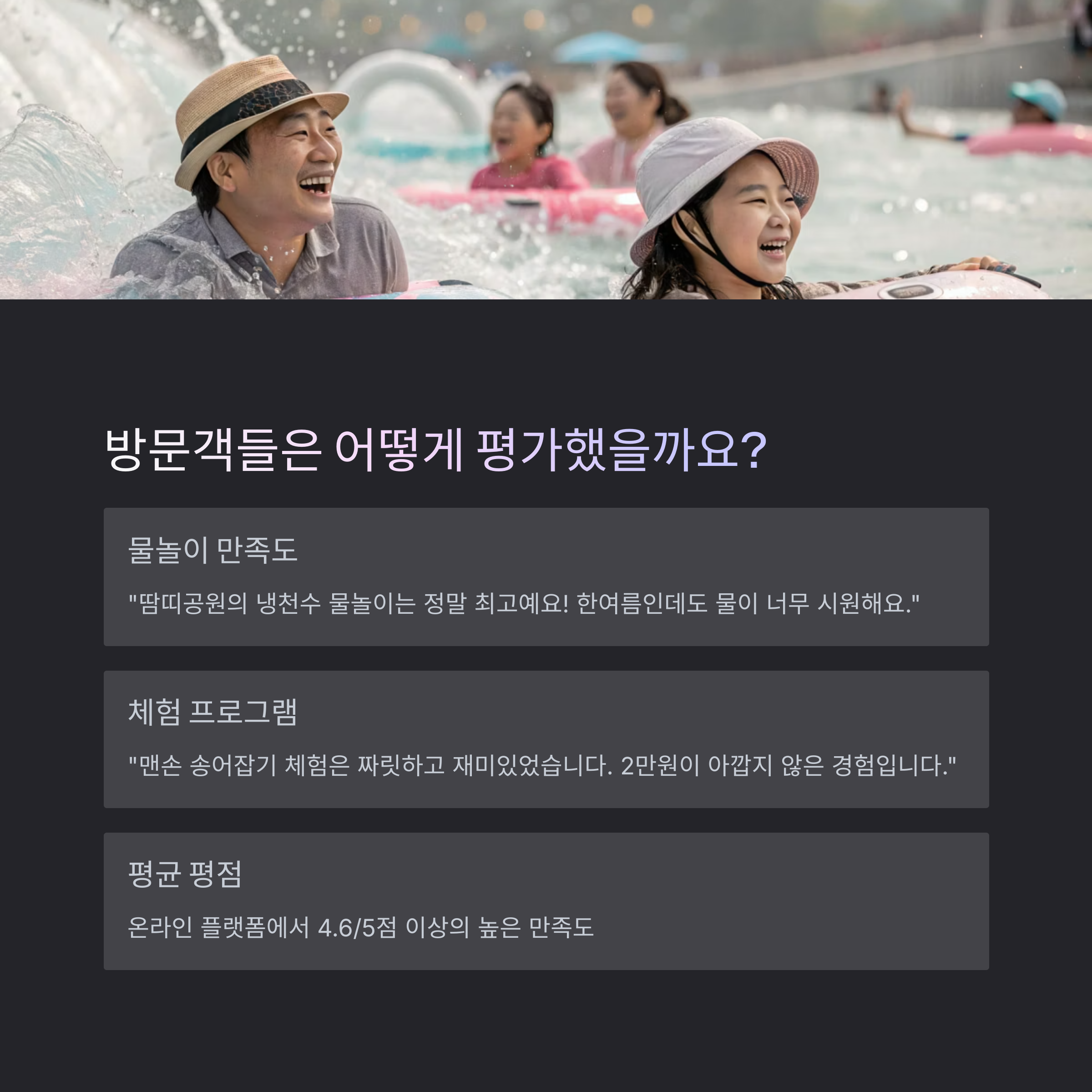 - 높은 만족도: 방문객들은 시원한 물놀이와 이색 체험, 맛있는 먹거리에 대해 긍정적인 평가를 많이 남깁니다.