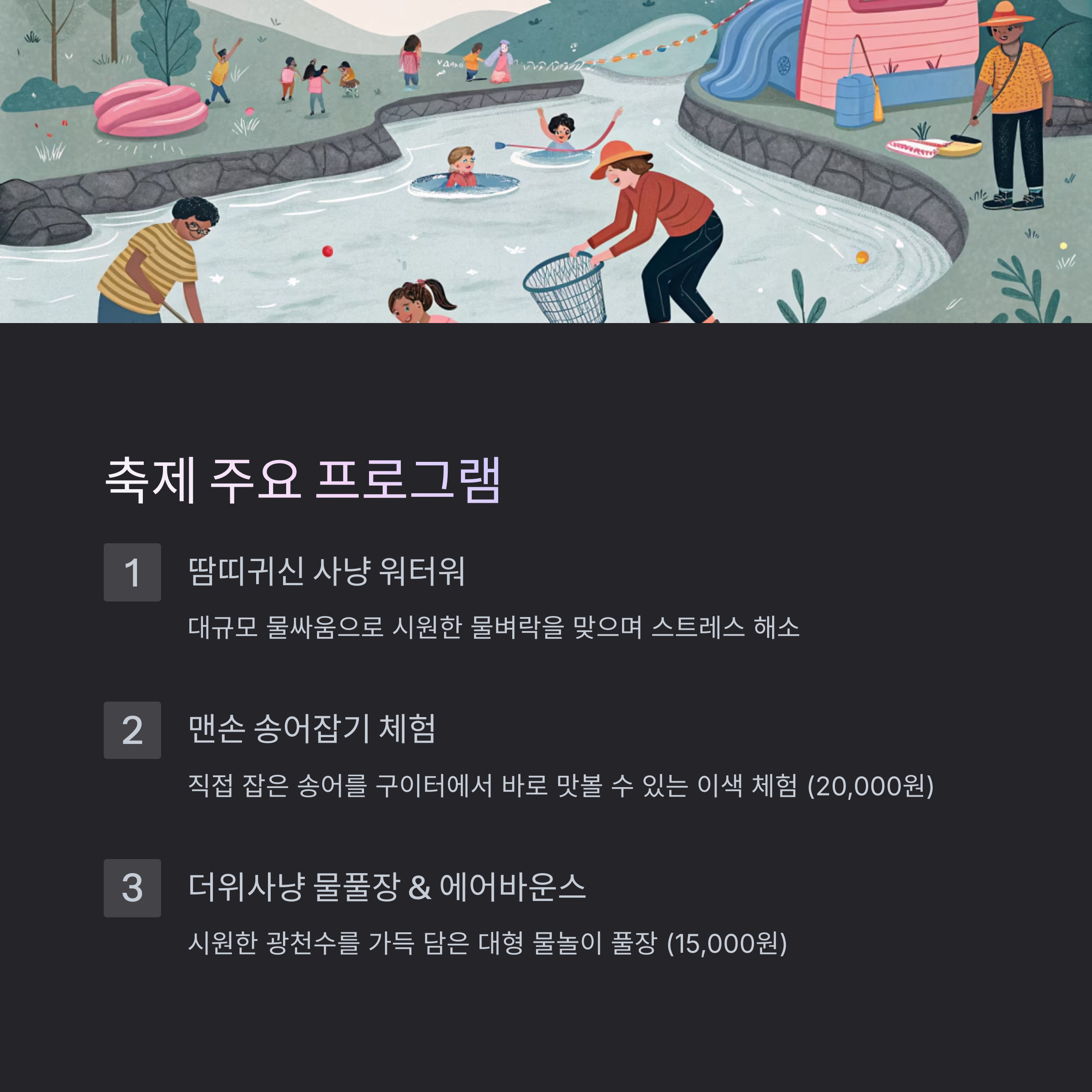 - 핵심 프로그램: 땀띠귀신 워터워, 맨손 송어잡기, 물풀장, 광천선굴 트랙터