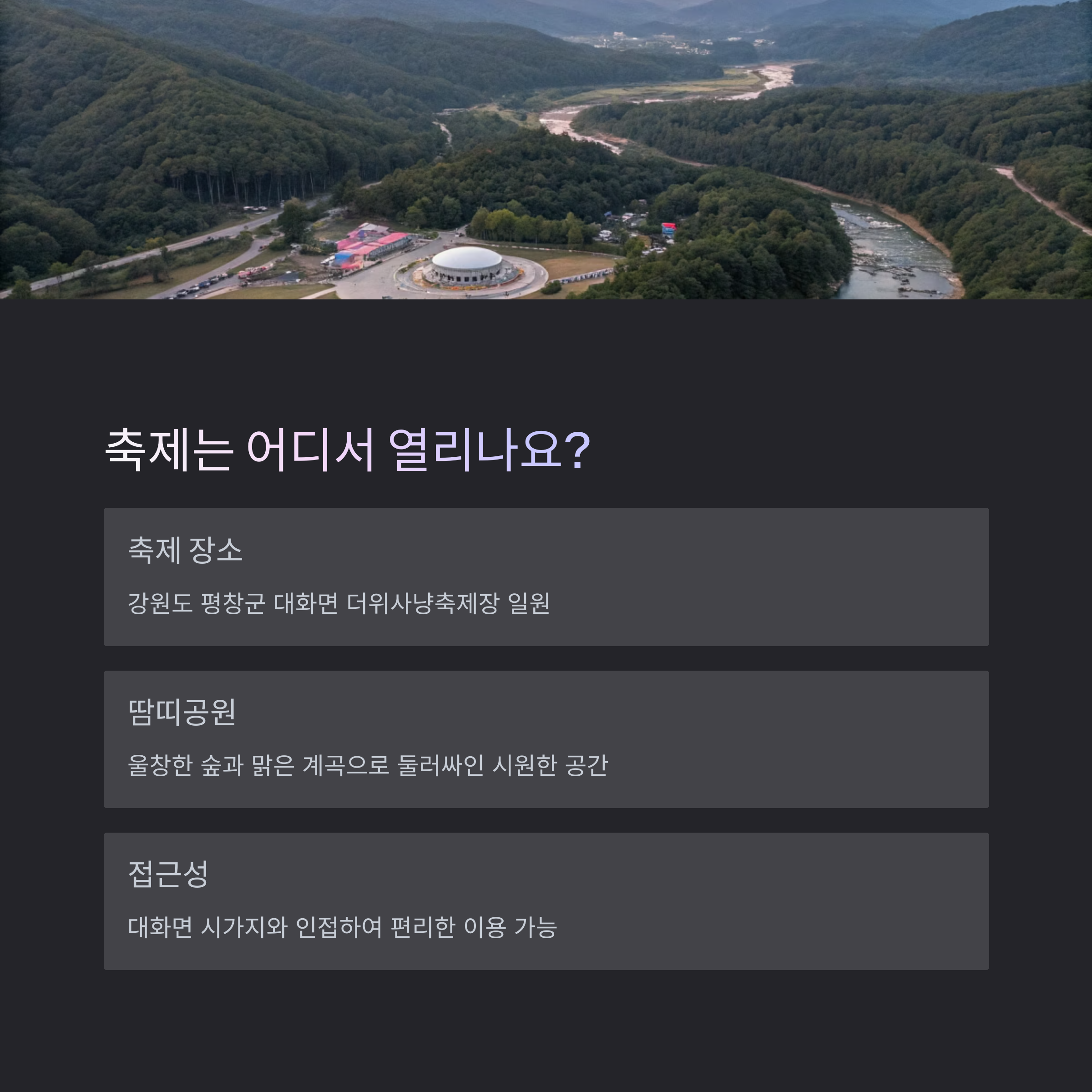 - 기차 (KTX): KTX 평창역 또는 진부역에서 하차 후, 지역 연계 버스나 택시를 이용해 대화면 축제장으로 이동할 수 있습니다.