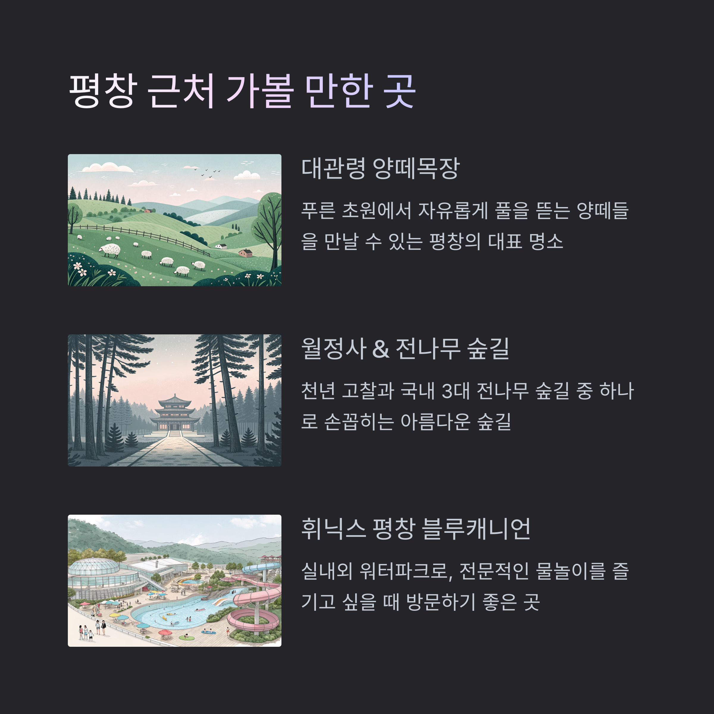 - 주변 연계: 대관령 양떼목장, 월정사 등 평창의 주요 관광지와 연계하여 알찬 여행을 계획할 수 있습니다.