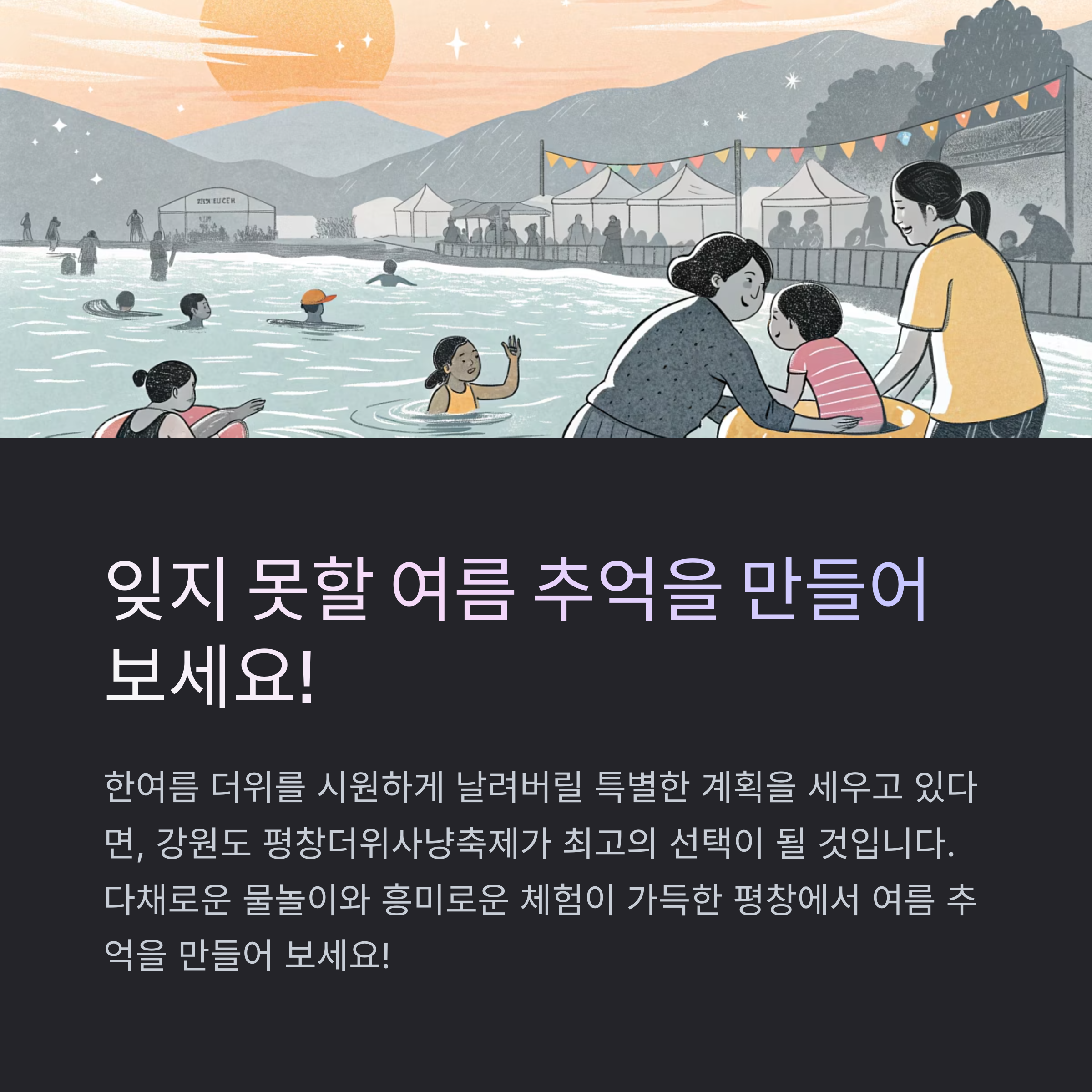 한여름 더위를 시원하게 날려버릴 특별한 계획을 세우고 있다면, 강원도 평창더위사냥축제가 최고의 선택이 될 것입니다. 다채로운 물놀이와 흥미로운 체험, 맛있는 먹거리가 가득한 평창에서 잊지 못할 여름 추억을 만들어 보세요!